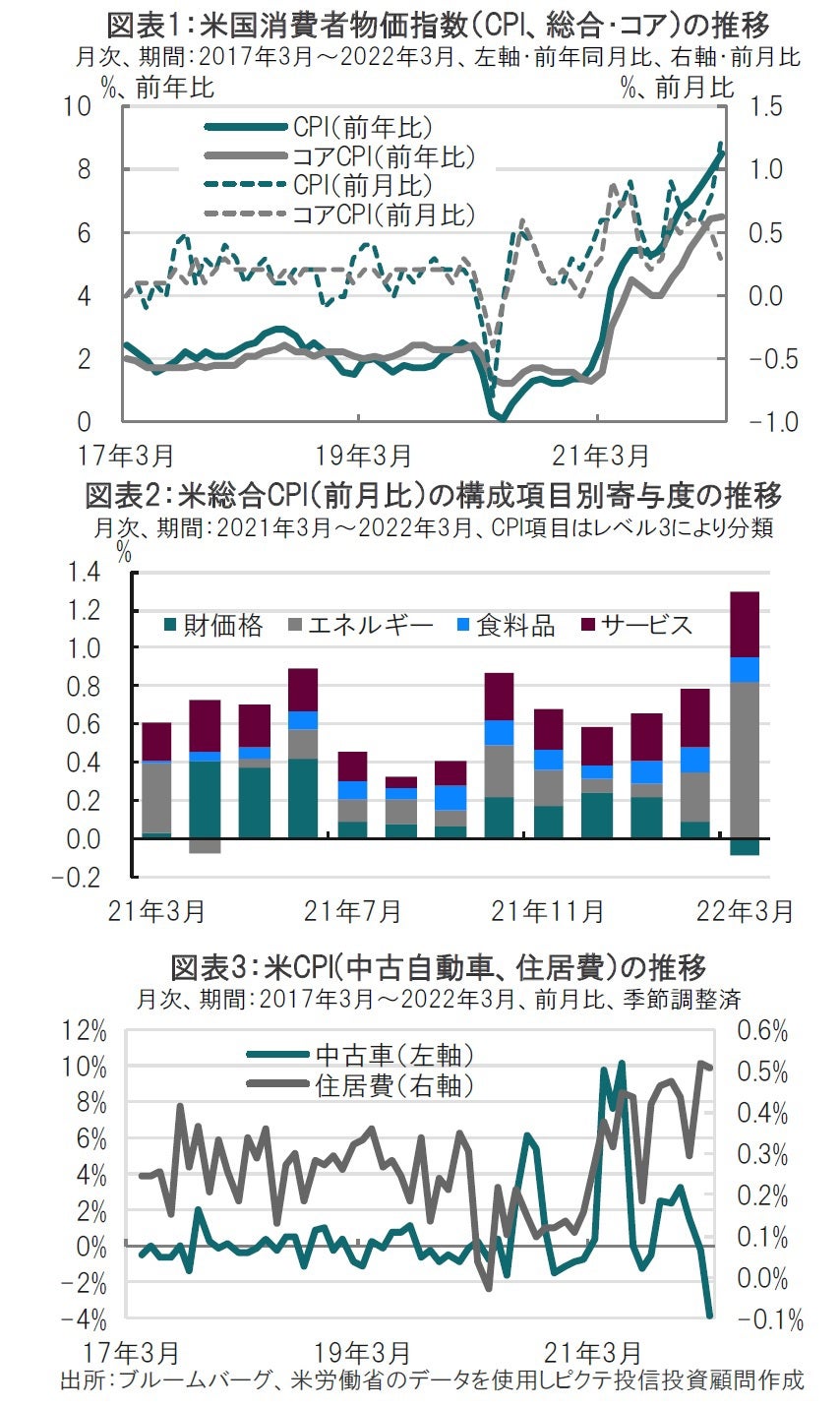 米労働省が2022年4月12日に発表した3月の消費者物価指数(CPI)は前年同月比で8.5%上昇と、約40年ぶりの水準となり、市場予想の同8.4%上昇、前月の同7.9%上昇を上回りました(図表1参照)。