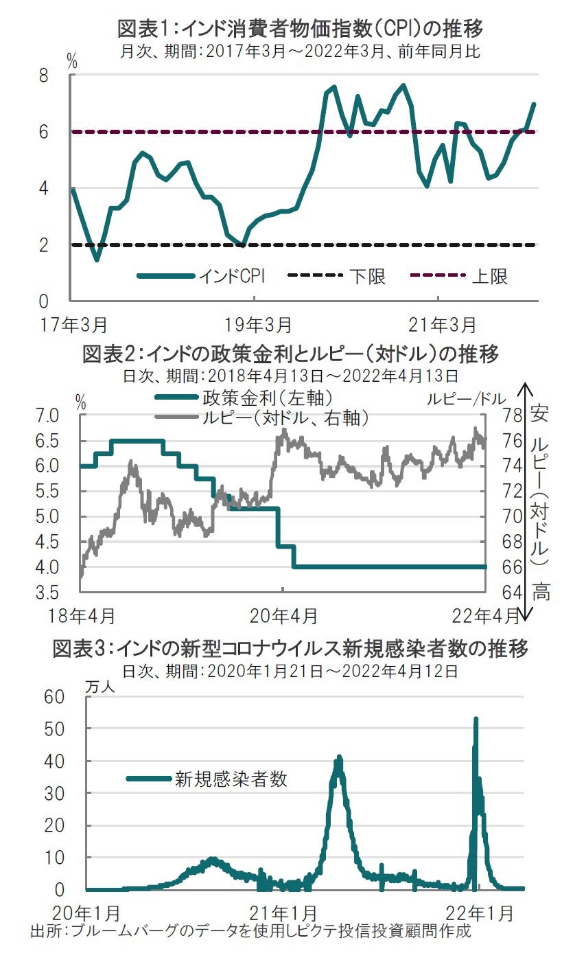 インド統計局が2022年4月12日に発表した3月の消費者物価指数(CPI)は前年同月比6.95%上昇と、市場予想の6.40%、前月の6.07%を上回りました(図表1参照)。インド準備銀行(中央銀行)のインフレ目標は4%±2%です。
