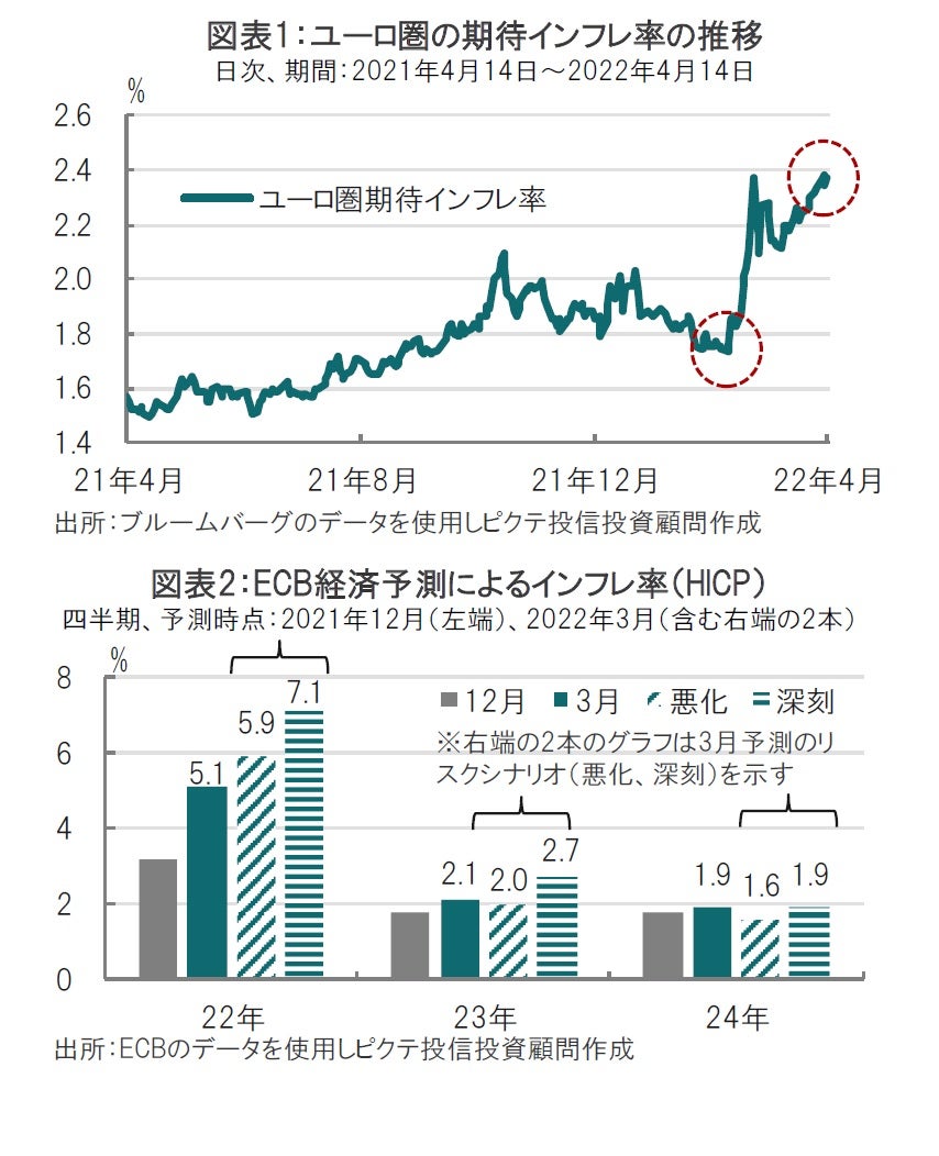 ユーロ圏の消費者物価指数(HICP)は3月が前年同月比で7.5%上昇と歴史的高水準です。また金融政策を運営する上で重視する市場の期待インフレ率はロシアの軍事侵攻以降急上昇し、インフレ目標の水準である2%をゆうに超え、4月13日には2.4%台をつけています(図表1参照)。したがって、記者会見の冒頭に(従来述べられなかった)期待インフレ率上昇に対する警戒感が示されています。