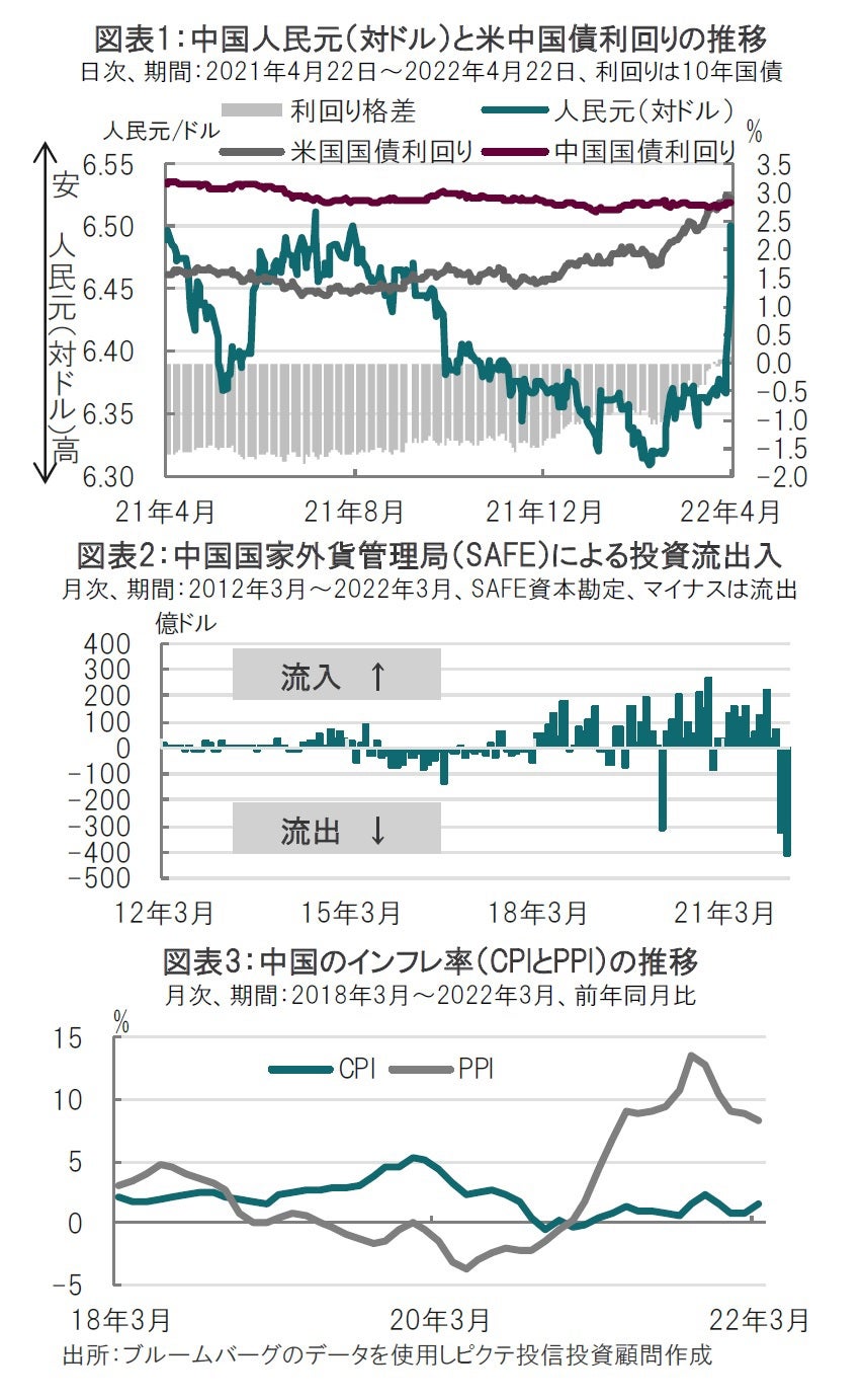 中国人民元安が急速に進行しています(図表1参照)。中国人民銀行(中央銀行)が2022年4月25日に発表した同日の人民元中心レートは1ドル=6.4909元と、前日に比べ変動率は約0.5%と人民元安方向となっています。