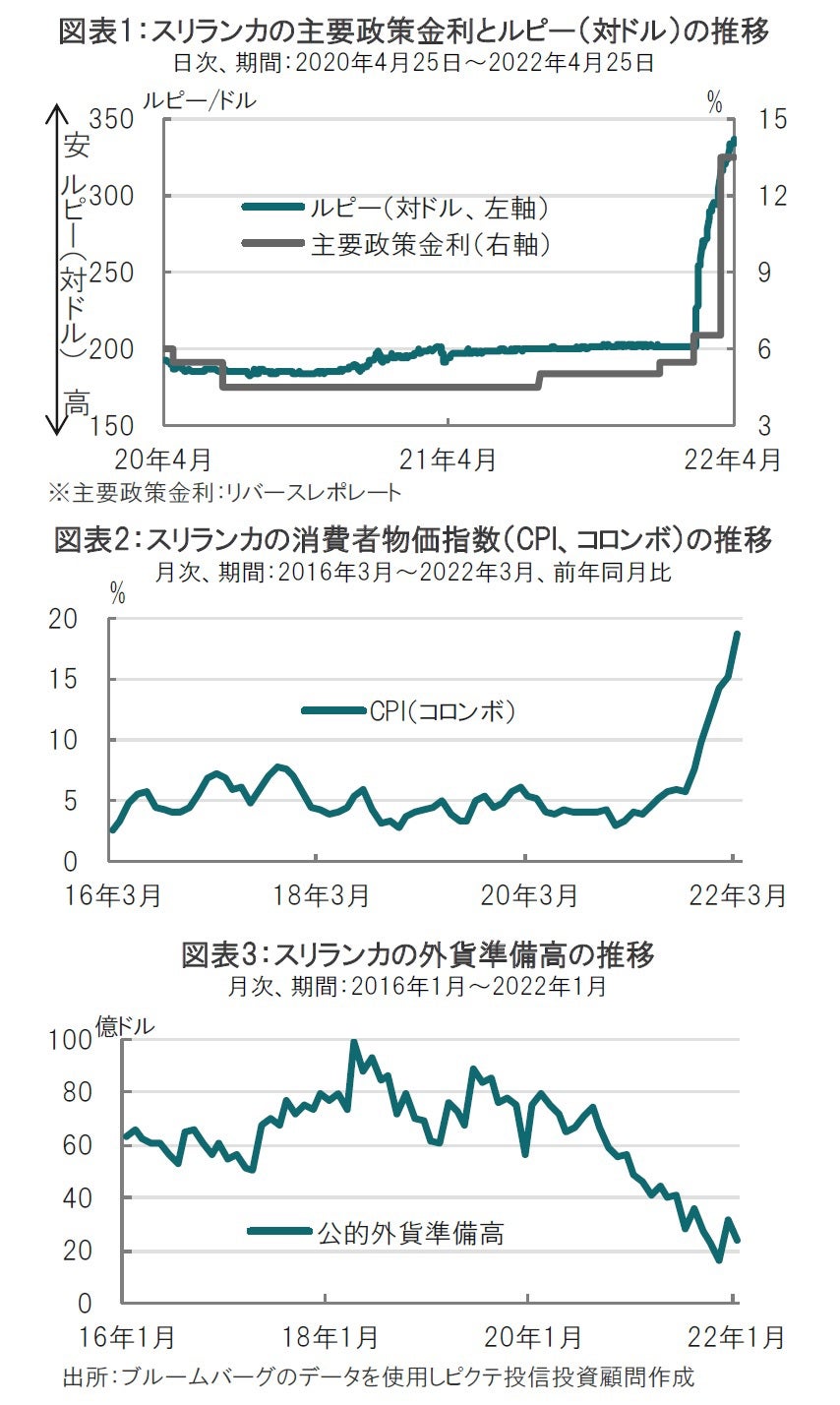 まず、スリランカの経済状況を見ると足元急速に悪化しています。例えばスリランカ中央銀行は3月にルピーのドルペッグを緩和し(図表1参照)、政策金利も引き上げました。スリランカの消費者物価指数(CPI)が、エネルギーや食料品価格の上昇などを背景に急上昇したためドルペッグを維持することが困難となったためです。