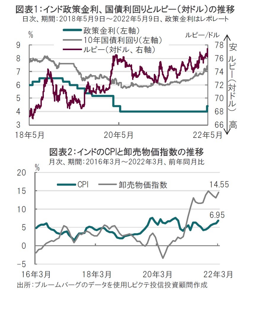日本の連休中の注目イベントとして、5月3~4日開催の米連邦公開市場委員会(FOMC)がありましたが、インドでは予定外に金融政策会合が開催され利上げが決定されました。急速な米国金利の上昇に加え、サプライチェーンの混乱やロシアの軍事侵攻による物価動向の不確実性の高まりなどが、インド中銀に利上げ対応の前倒しを迫る結果になったと見ています。