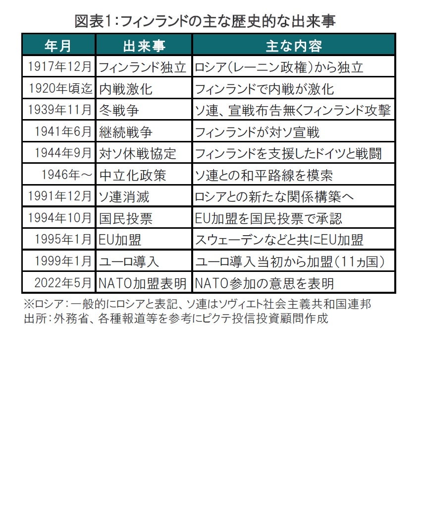 例えば、フィンランドでは、軍事侵攻前の2月の世論調査においてNATO加盟の支持率は概ね3割を下回る水準でした。しかしロシアがウクライナへ軍事侵攻した後の3月には6割を上回る支持となっており、これまで支持されてきた政策である中立化からの脱却が見込まれます。そこで、フィンランドを例に中立化の流れを振り返ります(図表1参照)。