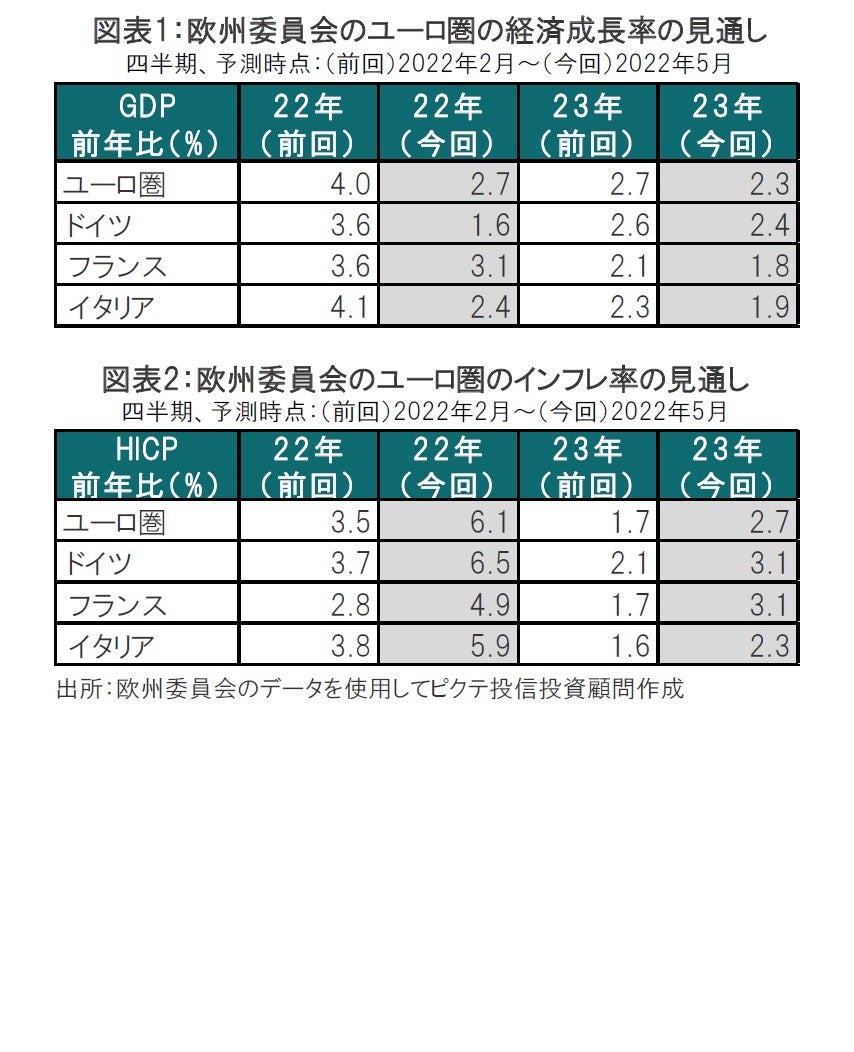 EUの政策執行を担当する欧州委員会(EC)は16日、四半期毎に公表している経済見通しをリリースしました。ユーロ圏の22年の実質GDP成長率見通しは2.7%と、前回(2月)の4.0%から下方修正しました(図表1参照)。