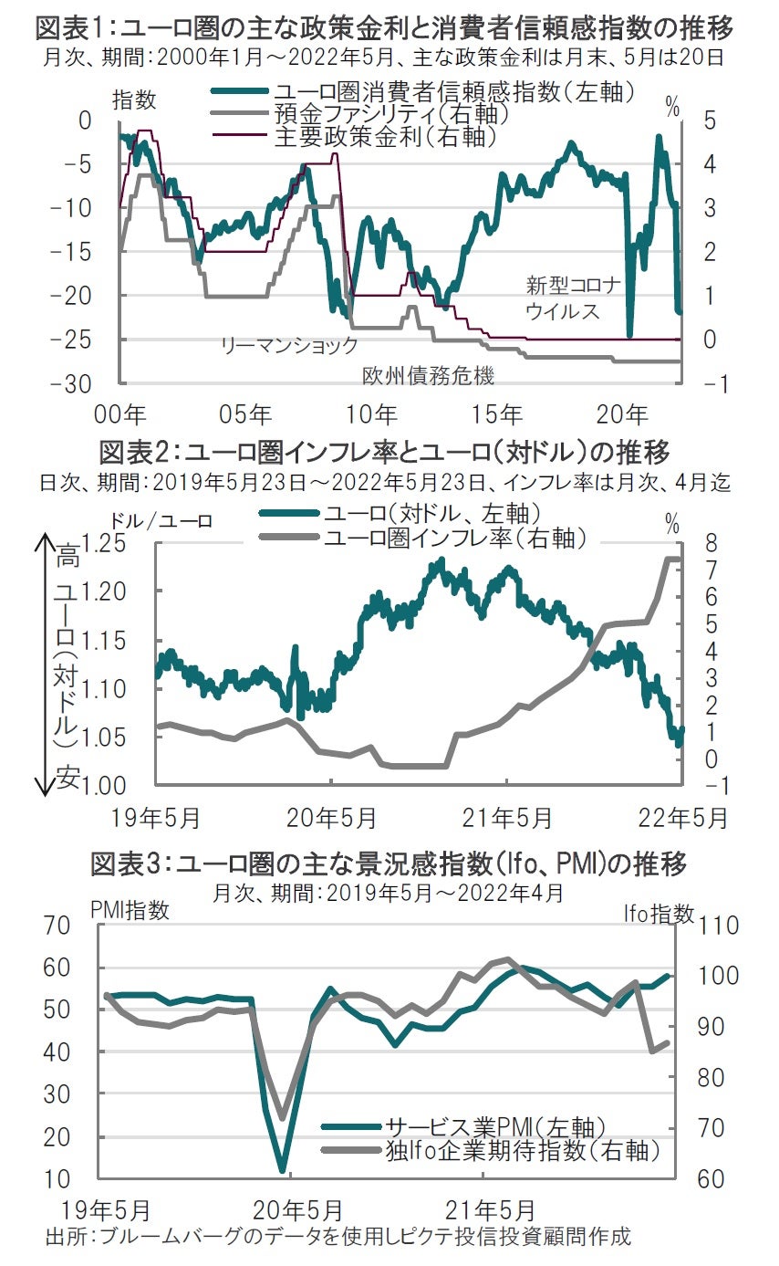 消費者信頼感指数を低下させた要因としてロシアのウクライナへの軍事侵攻によるセンチメントの悪化と、ユーロ圏のインフレ率上昇があげられます(図表2参照)。4月のユーロ圏消費者物価指数(HICP)は前年同月比7.4%と前月同様、ユーロ開始以来の高水準となっています。エネルギー価格上昇がインフレ率高騰の要因とはいえ、許容しがたい水準であることがECBの政策スタンスに影響したと思われます。またユーロ圏のインフレを懸念する別の要因も見られます。1つは米国とユーロ圏の金融政策を反映したユーロ安で、ユーロ安による輸入インフレが懸念されます。