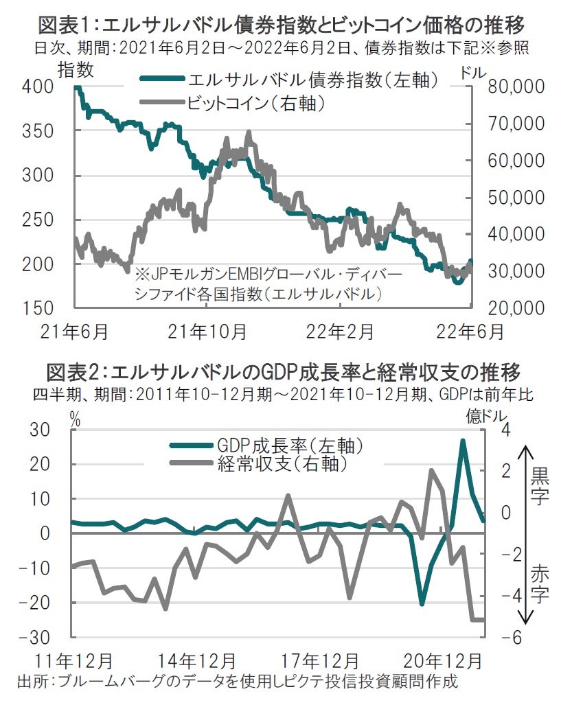 まず、ビットコインを法定通貨としたことによる弊害があげられます。エルサルバドルは昨年9月にビットコインを法定通貨として運用を開始しました(図表1参照)。開始後ビットコイン価格が上昇する局面もありましたが、足元では大幅下落となっています。報道機関の推計ではエルサルバドル政府が被る累積損失額は、6月半ばに期限を迎える2035年償還債券の利払い額に相当する模様と伝えています。
