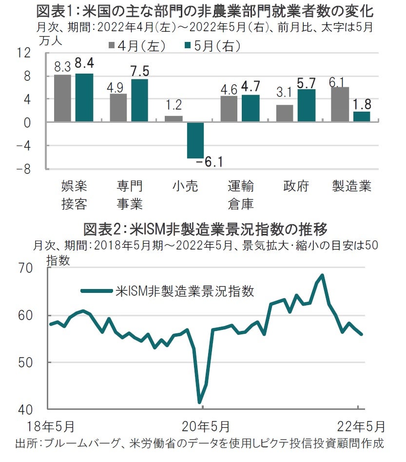 5月の米雇用統計の就業者数を部門別に見ると、経済活動の再開を受け娯楽・接客や、運輸倉庫、専門事業などは雇用を確保しています(図表1参照)。一方で、小売は前月比マイナスです。小売部門には企業決算で業績が悪化した企業も見られ、採用ペースの鈍化が見られます。