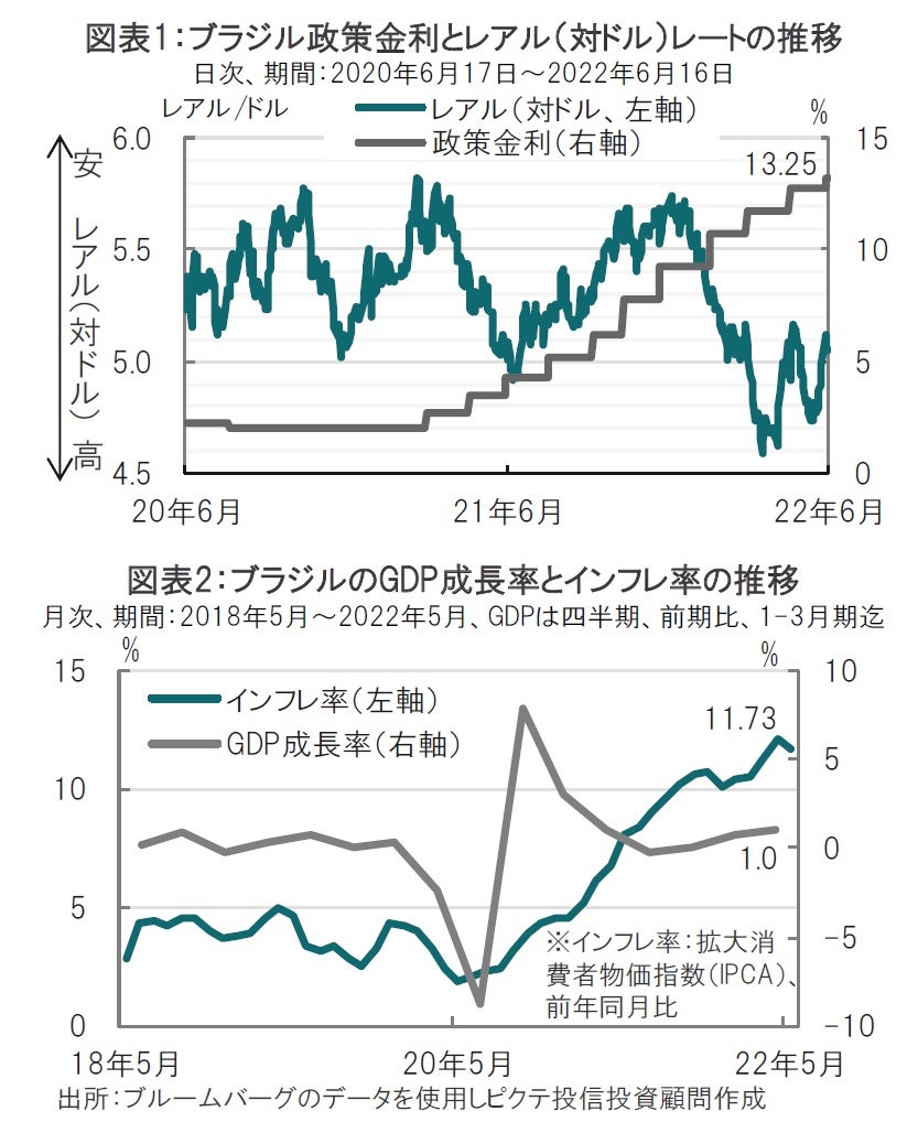 ブラジル中央銀行は2022年6月15日、政策金利を市場予想通り0.5%引き上げ13.25%にするとともに、次回会合での同幅またはそれより小幅の利上げを示唆しました(図表1参照)。21年3月以降の利上げ局面で、合計の利上げ幅は11.25%となりました。