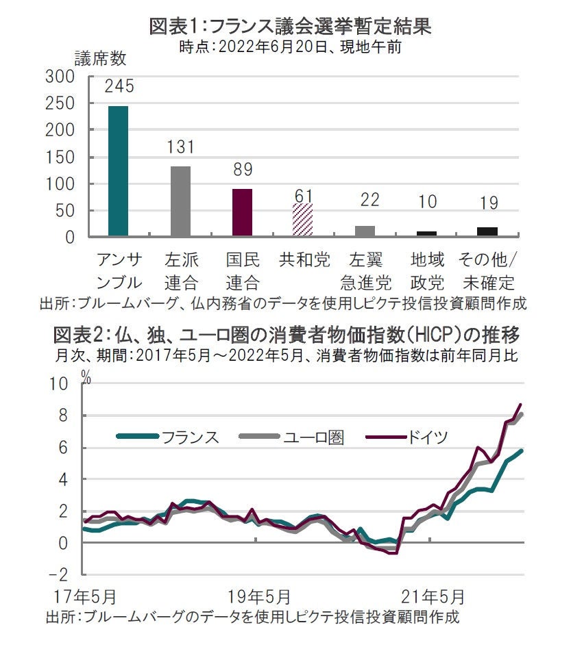 フランスでは、2022年6月19日にフランス国民議会(下院、577議席)の決選投票が投開票されました。マクロン大統領が率いる与党連合(アンサンブル)は議席を大きく減らし、過半数(289議席)を下回りました(図表1参照)。