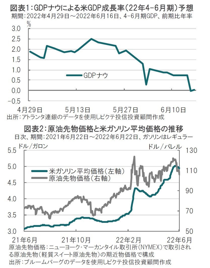 最後に、パウエル議長が景気後退の可能性があることを認める発言をした点も注目です。市場の一部は、この点がサプライズであったかもしれません。米国の4-6月期GDP(国内総生産)成長率をアトランタ連銀が算出しているGDPナウで占うと、足元ほぼゼロ成長です(図表1参照)。今後発表される経済データ次第で上方修正される可能性は十分残されています。パウエル議長も証言の中で堅調な個人消費などを背景に4-6月期の景気回復に期待を示しています。しかし、足元の数字では、景気の先行きに注意が必要です。