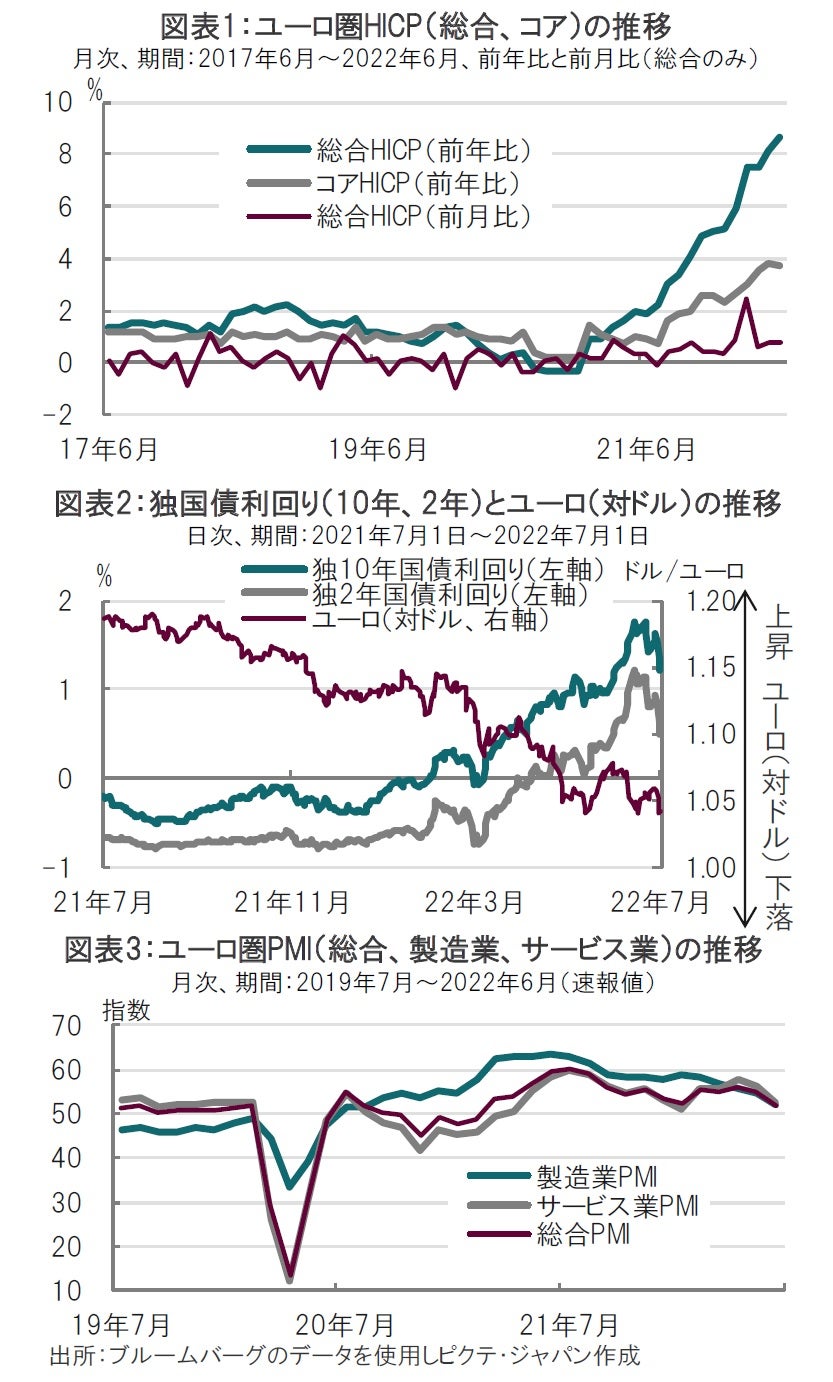 欧州連合(EU)統計局(ユーロスタット)が2022年7月1日に発表した6月のユーロ圏消費者物価指数(HICP)上昇率は前年同月比8.6%と、市場予想の8.5%、5月の8.1%を上回りました(図表1参照)。