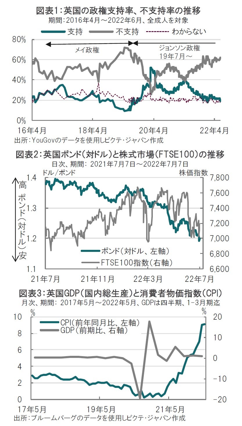 英国のジョンソン首相が2022年7月7日、国民向けの演説で辞任を正式に表明しました。政権内での不祥事が続き、閣僚や与党・保守党内の離反が相次ぐ中、約3年にわたった政権に幕を下ろしました(図表1参照)。