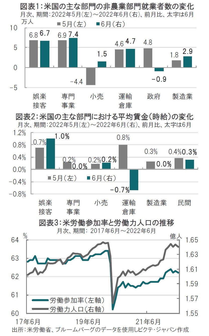 米労働省が2022年7月8日に発表した6月の米雇用統計によると、非農業部門の就業者数(事業所調査)は前月から37.2万人増で、市場予想の26.5万人増を上回りましたが、前月の38.4万人増を下回りました(図表1参照)。