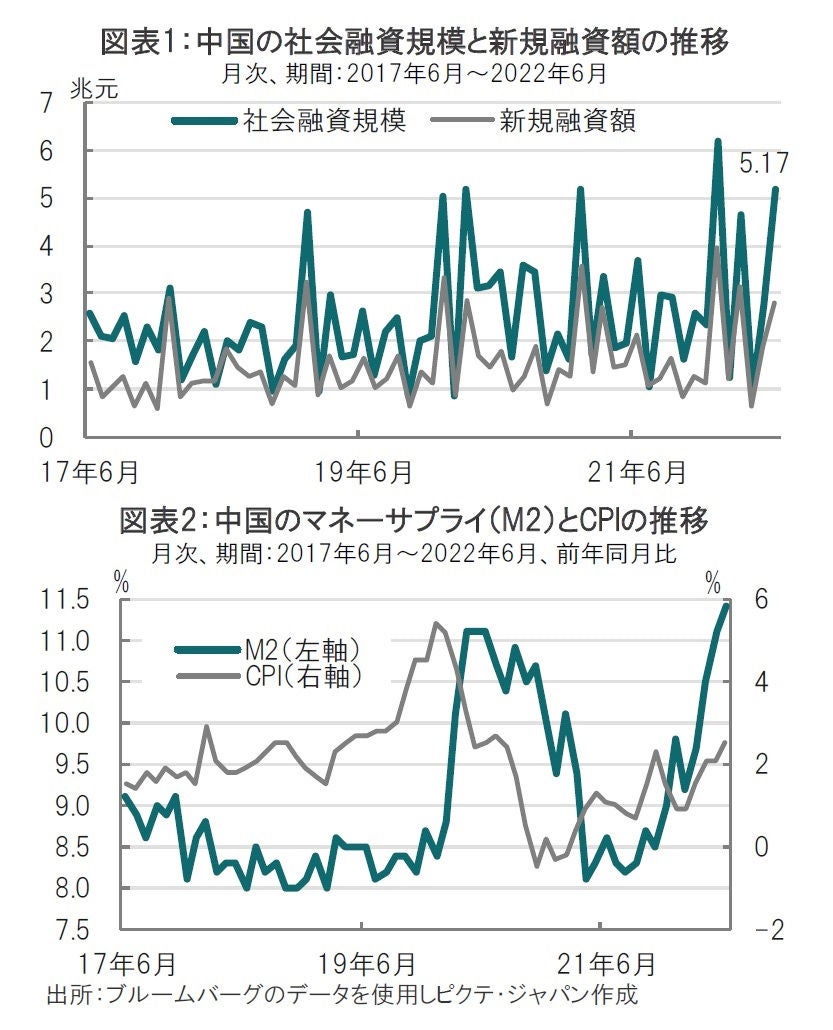 中国人民銀行(中央銀行)が2022年7月11日に発表した社会融資規模の6月の新規調達額は約5兆1700億元(約104兆8000億円)で、市場予想の4兆2000億元、前月の2兆8000億元を上回りました(図表1参照)。残高は6月末で334兆元と、前年同月末から10.8%増えました。