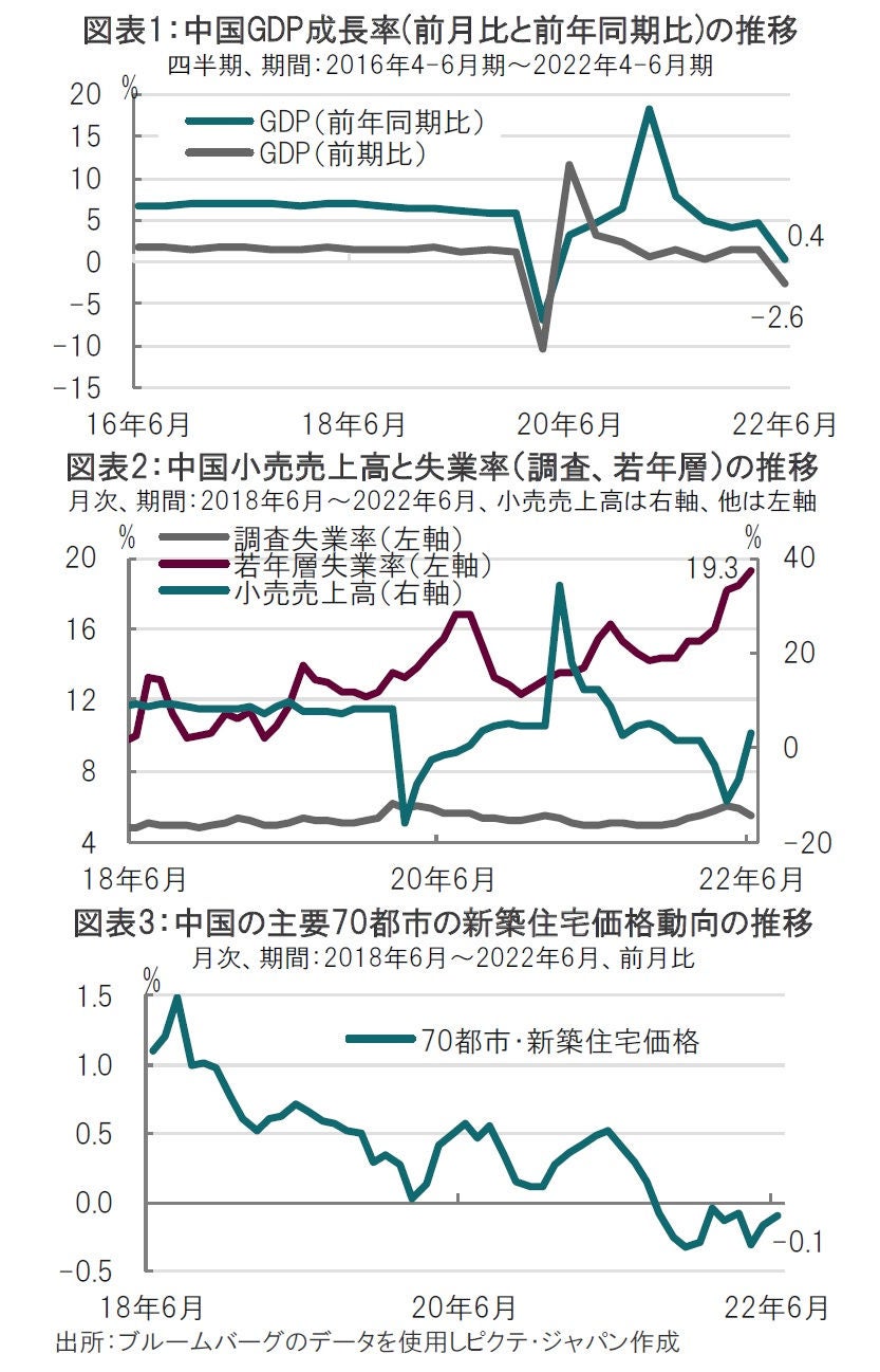 中国国家統計局が2022年7月15日発表した4-6月期のGDP(国内総生産)は前年同期比0.4%増と、市場予想の1.2%増、前期の4.8%増を下回りました(図表1参照)。前期比ではマイナス2.6%減でした。