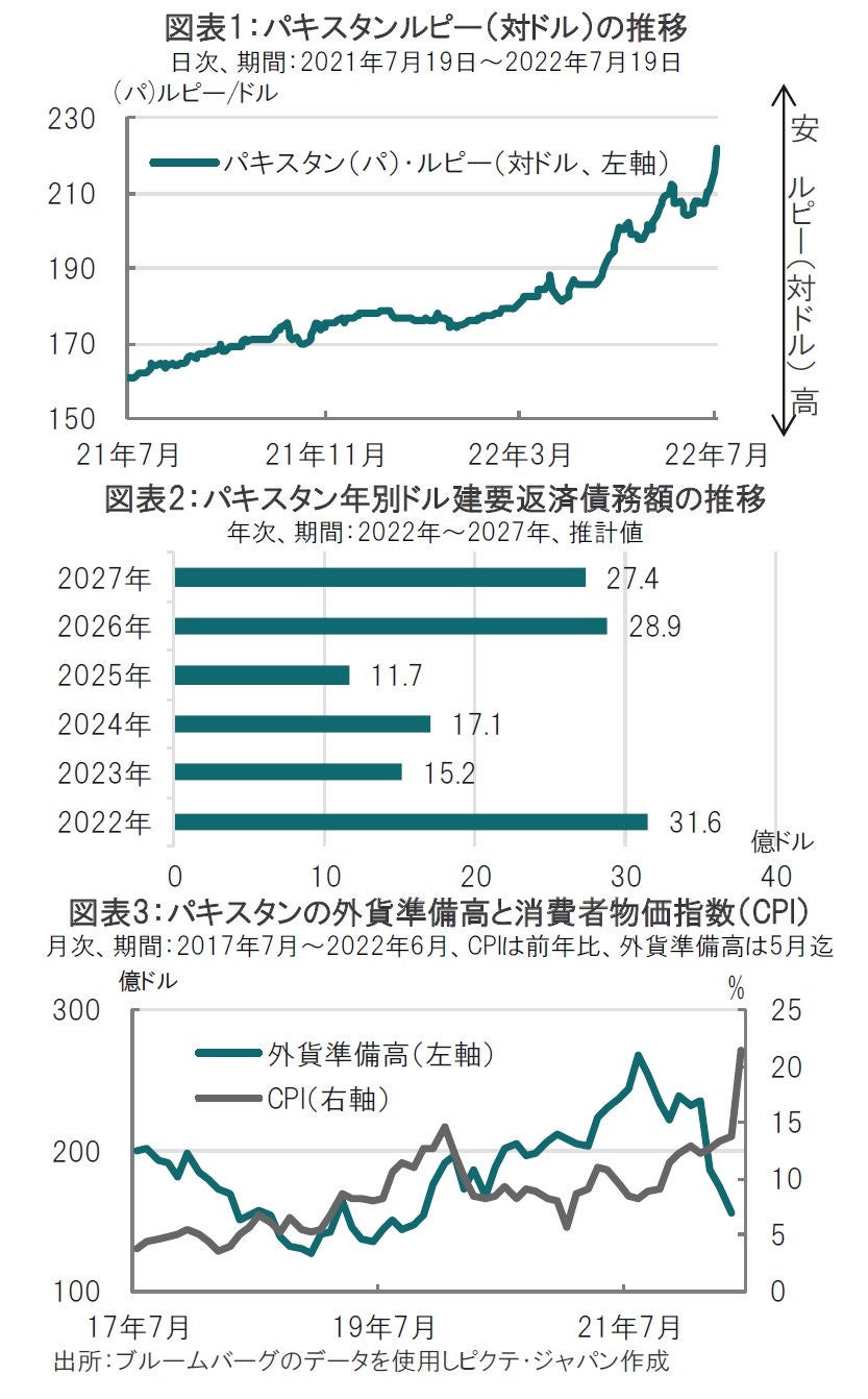 格付け会社フィッチ・レーティングスは2022年7月18日にパキスタンの格付け見通しを弱含み(ネガティブ)としました。下落傾向が続いているパキスタン・ルピーは足元でさらにルピー安が進行しています(図表1参照)。なお、フィッチはパキスタンの長期債格付け(自国通貨建て、外貨建て共に)をB-で据え置いています。
