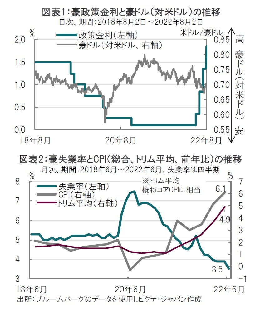 オーストラリア(豪)準備銀行(中央銀行)は、2022年8月2日の理事会で、政策金利を0.5%引き上げ年率1.85%にすることを決定しました(図表1参照)。豪中銀は4会合連続で利上げを実施、足元の3会合は連続して0.5%の大幅利上げを実施した結果、政策金利は1.85%となりました。