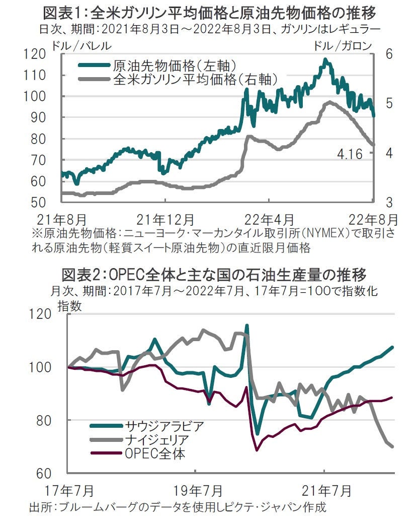 なお、3日のニューヨーク商業取引所のウェスト・テキサス・インターミディエート(WTI)先物9月限は、前日比3.76ドル安の1バレル=90.66ドルで終了しました(図表1参照)。原油先物価格は、ロシアがウクライナに侵攻する前の2月初旬以来の水準に下落しました。