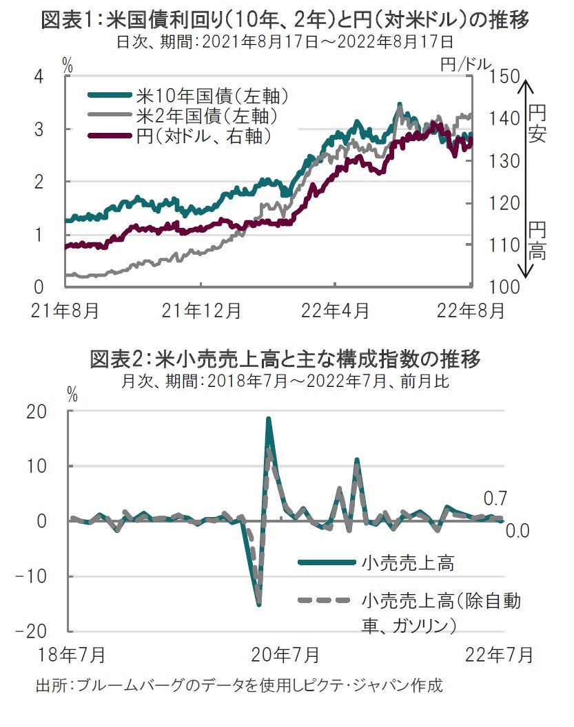 なお、議事要旨公表前に発表された7月の米小売売上高を見ると、前月比で0.0%と横ばいで個人消費の回復が鈍いようにも見えます(図表2参照)。しかしながら、自動車やガソリンを除いたベースでは前月比0.7%増とプラスを確保しています。6月半ばからガソリン価格が大幅に下落していることが小売売上高を抑えたためと見られ、実質的な消費に底堅い面も見られます。GDP(国内総生産)算出に使用されるコア小売売上高(除く飲食店、自動車、建材、ガソリンスタンド)は前月比0.8%増と比較的高水準でした。7月の小売売上高データを反映したアトランタ連銀が算出する7-9月期のGDP成長率予想は前期比年率1.6%増となっています。今後のデータ次第で最終的には上下する可能性はありますが、あくまで今のところはプラス成長です。米国は年前半がマイナス成長で形式的な景気後退となりました。しかし目先の深刻な景気後退懸念がやわらぐ可能性もある中で、9月FOMCを前に市場との対話が重みを増しそうです。