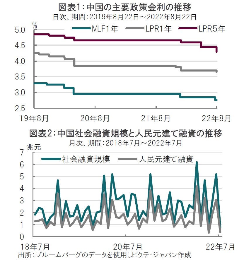 中国人民銀行は2022年8月22日に銀行貸出金利の指標となる1年物最優遇貸出金利(LPR、ローンプライムレート)を7月までの3.70%から0.05%引き下げ3.65%としました。住宅ローン金利の基準となる5年物LPRは7月までの4.45%から0.15%下げ4.30%としました(図表1参照)。