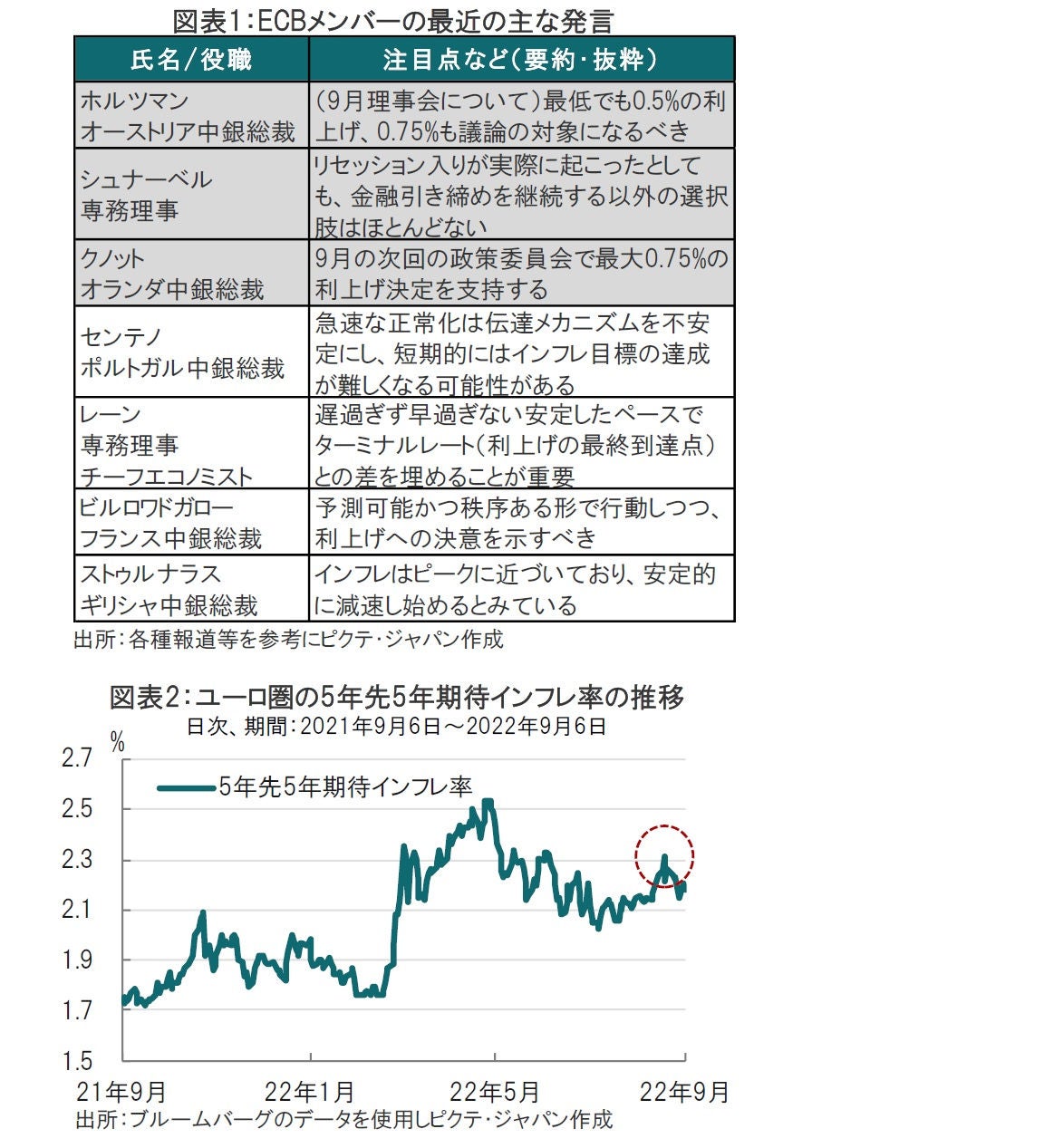 ユーロ圏のインフレ率はあらためて述べるまでもなく、天然ガスなどエネルギー価格の上昇を背景に9%を超える高水準となっています。もっとも、エネルギーだけがインフレの原因でなく、タカ派のメンバーの懸念には他の要因もあるようです。例えば、期待インフレ率の上昇です(図表2参照)。ECBが期待インフレ率として参照する5年先の5年期待インフレ率はジャクソンホール会議前には2.3%を上回りました。足元同期待インフレ率が低下したことから、シュナーベル専務理事などのタカ派発言はそれなりに効果があったようです。