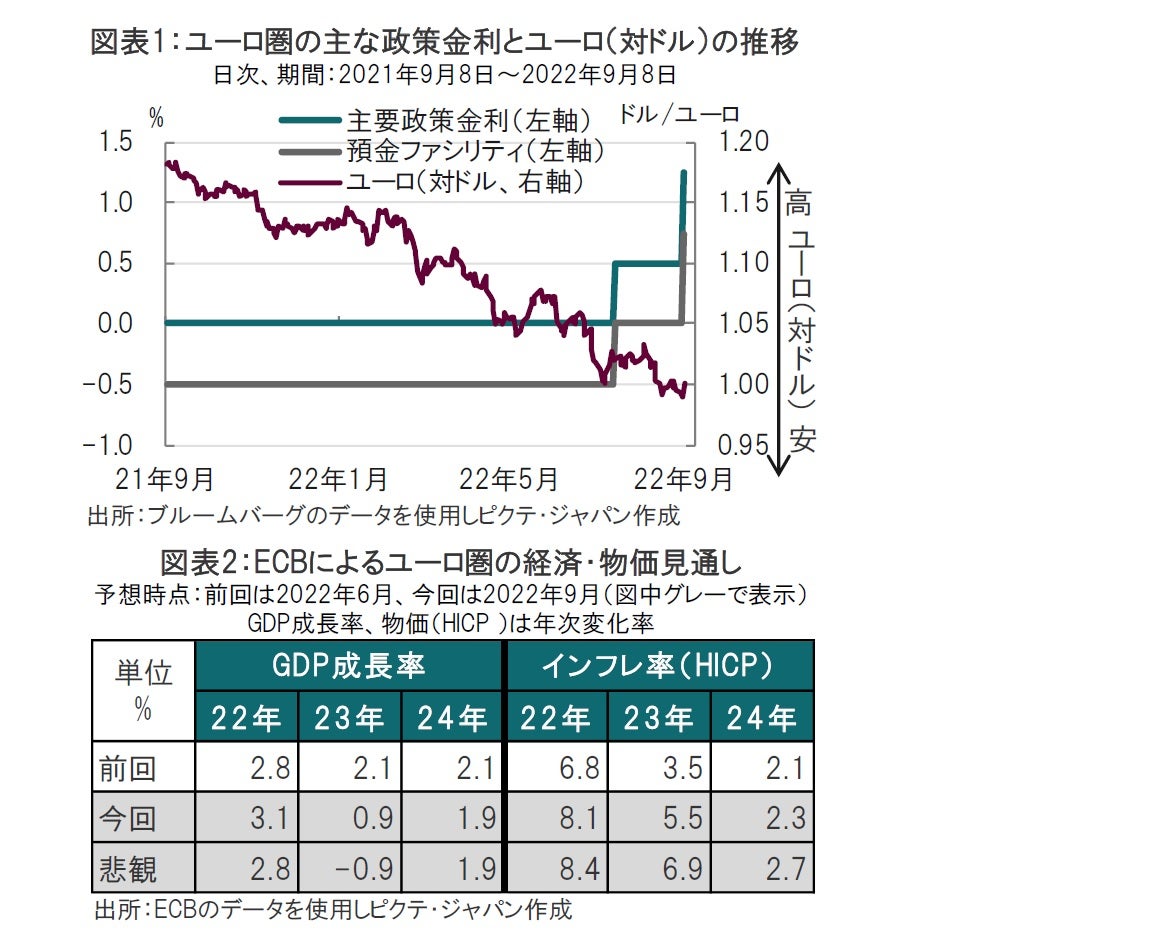 欧州中央銀行(ECB)は2022年9月8日の政策理事会で主な政策金利を0.75%引き上げると決定しました。主要政策金利をプラス0.5%からプラス1.25%、銀行が中央銀行に預ける際の金利(中銀預金金利)を0%からプラス0.75%に引き上げました(図表1参照)。市場では大半が通常(0.25%)の3倍となる今回の大幅利上げを予想していました。