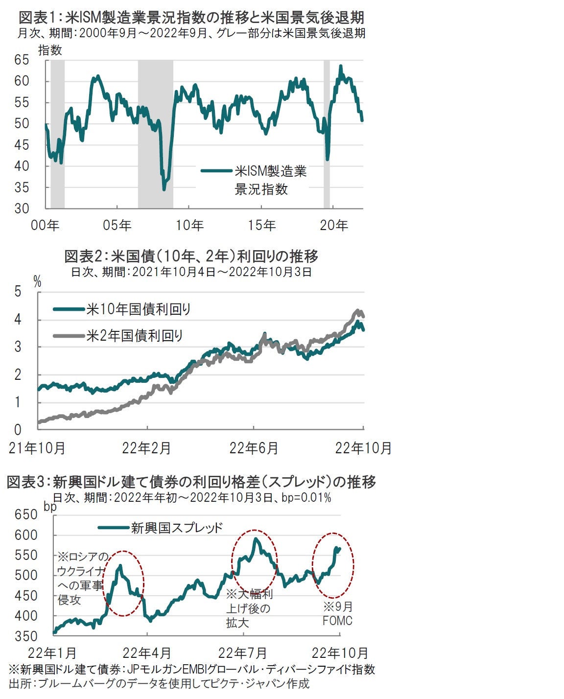 今回の利回り低下要因として米ISM製造業景況指数が挙げられます。FRBは景気を犠牲にしてでもインフレを抑える姿勢を明確にしており、場合によっては景気後退入りも辞さない覚悟とみられます。ただ、それも程度の問題で、深刻な景気後退に陥るとなると話は別とみられます。米ISM製造業景況指数と最近の景気後退を重ねると、同指数の40台前半は警戒ラインと見られます。米経済は底堅く、現状、若干の余地は残されていますが、9月の新規受注が軟調であった点など気がかりな面もあり、同指数の先行きに注視が必要です。