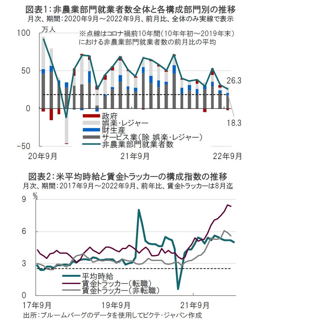 米労働省が2022年10月7日に発表した9月の雇用統計によると、非農業部門の就業者数は前月から26.3万人増と、市場予想の25.5万人増を上回りました(図表1参照)。8月は31.5万人増でした。失業率は3.5%と、市場予想、前月(ともに3.7%)を下回り、コロナ禍が深刻化する前の20年2月の水準(3.5%)にまで低下しました。