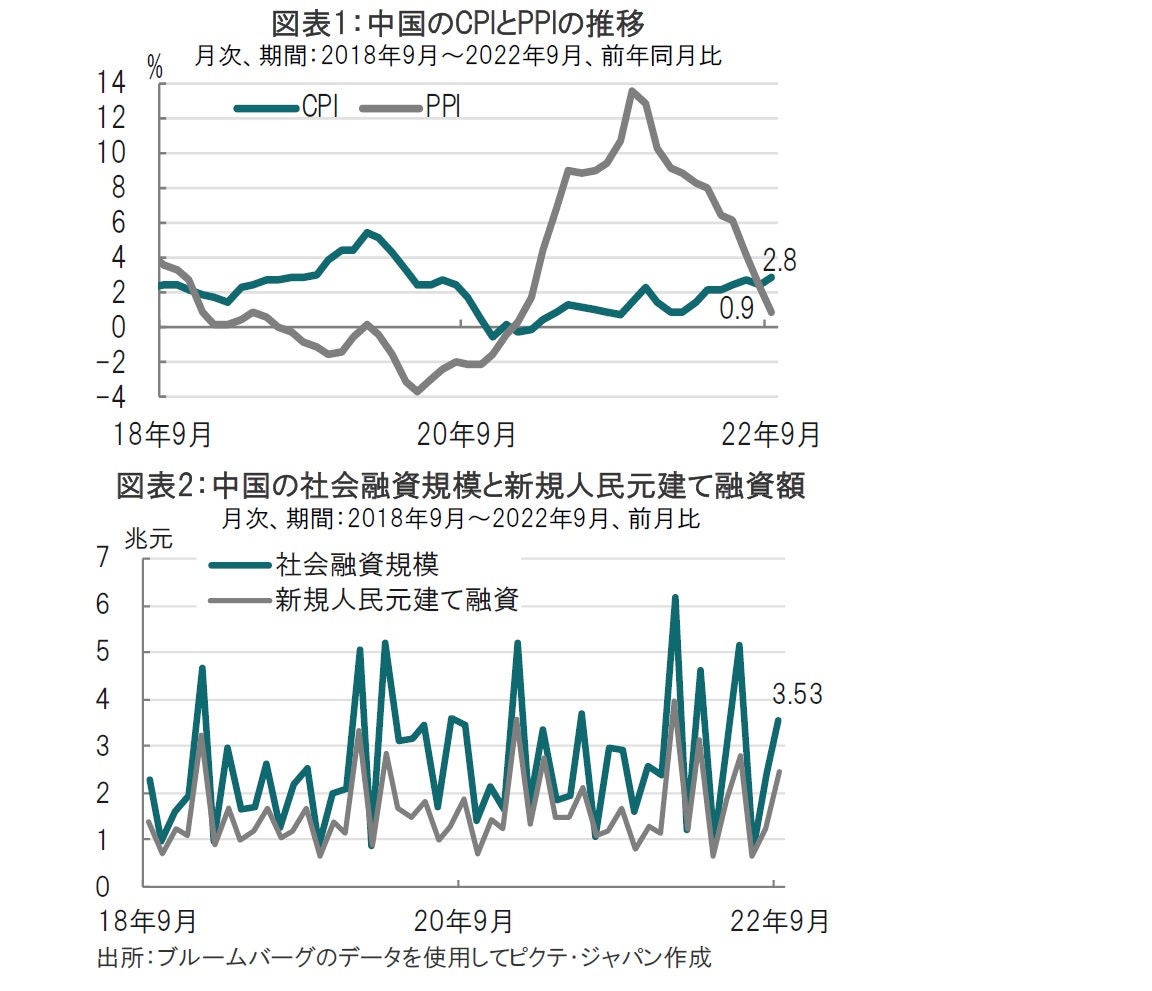 中国国家統計局が2022年10月14日に発表した9月の消費者物価指数(CPI)は前年同月比2.8%上昇と、市場予想の2.9%上昇は下回るも、前月の同2.5%上昇を上回りました(図表1参照)。同時に発表された9月の卸売物価指数(PPI)は前年同月比0.9%の上昇でした。