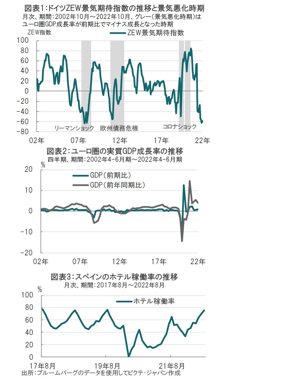 しかしながら、ユーロ圏の経済は22年前半は底堅く推移しました。財政政策などの効果も想定されますが、主要な下支え要因として、コロナウイルスの感染拡大が落ち着いたことによる経済再開の寄与が大きいとみられます。例えば、ドイツでは3月18日にコロナ関連規制が解除され、買物時のワクチン接種証明書の提示が不要となったり、大規模イベントの開催も解禁されました。フランスも3月からマスク着用義務が撤廃されるなど経済活動の再開が欧州で進みました。南欧では観光産業が回復し、例えばスペインのホテルの稼働率はコロナ前の水準をほぼ回復しています(図表3参照)。