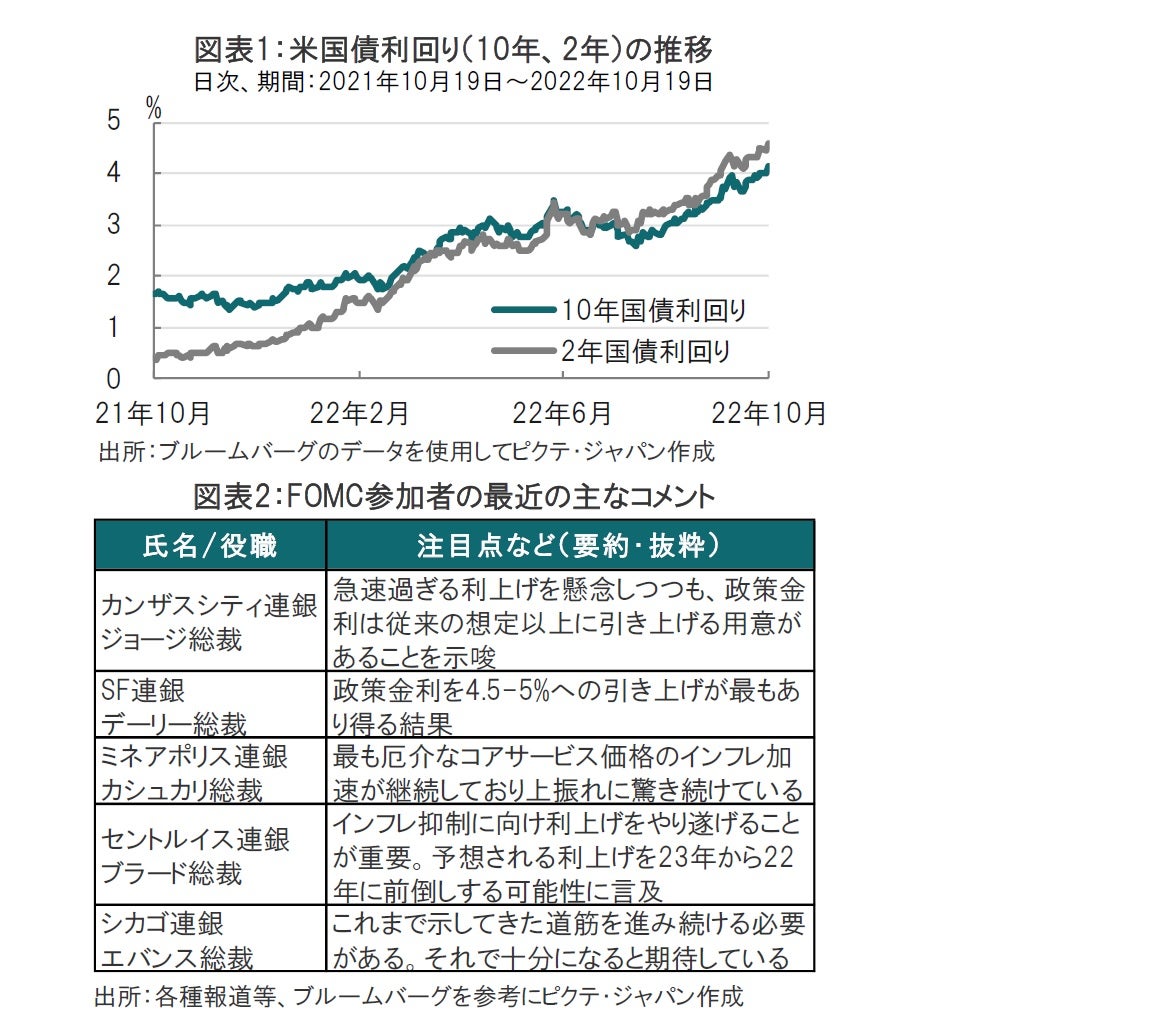 10月19日の米国債市場では10年国債利回りが4.1%を上回りました(図表1参照)。インフレへの警戒や金融政策引き締め観測は依然根強いと見られます。なお、11月のFOMCを前に、10月22日からFOMC参加者は、金融政策に関する発言を控えるブラックアウト期間となります。それを前に、発言などを整理(図表2参照)し、FOMCのポイントを確認します。なお、図表2のコメントは9月の米消費者物価指数(CPI、10月13日発表)発表後のコメントを中心に提示しています。