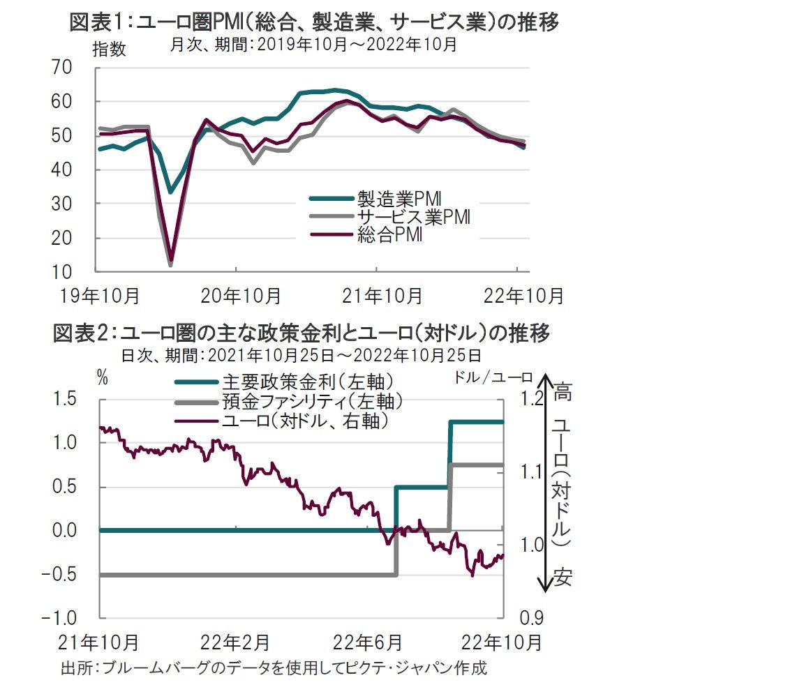 米S&Pグローバルが2022年10月24日に発表した10月のユーロ圏の購買担当者景気指数(PMI)は総合が47.1と市場予想の47.6、前月の48.1を下回りました(図表1参照)。