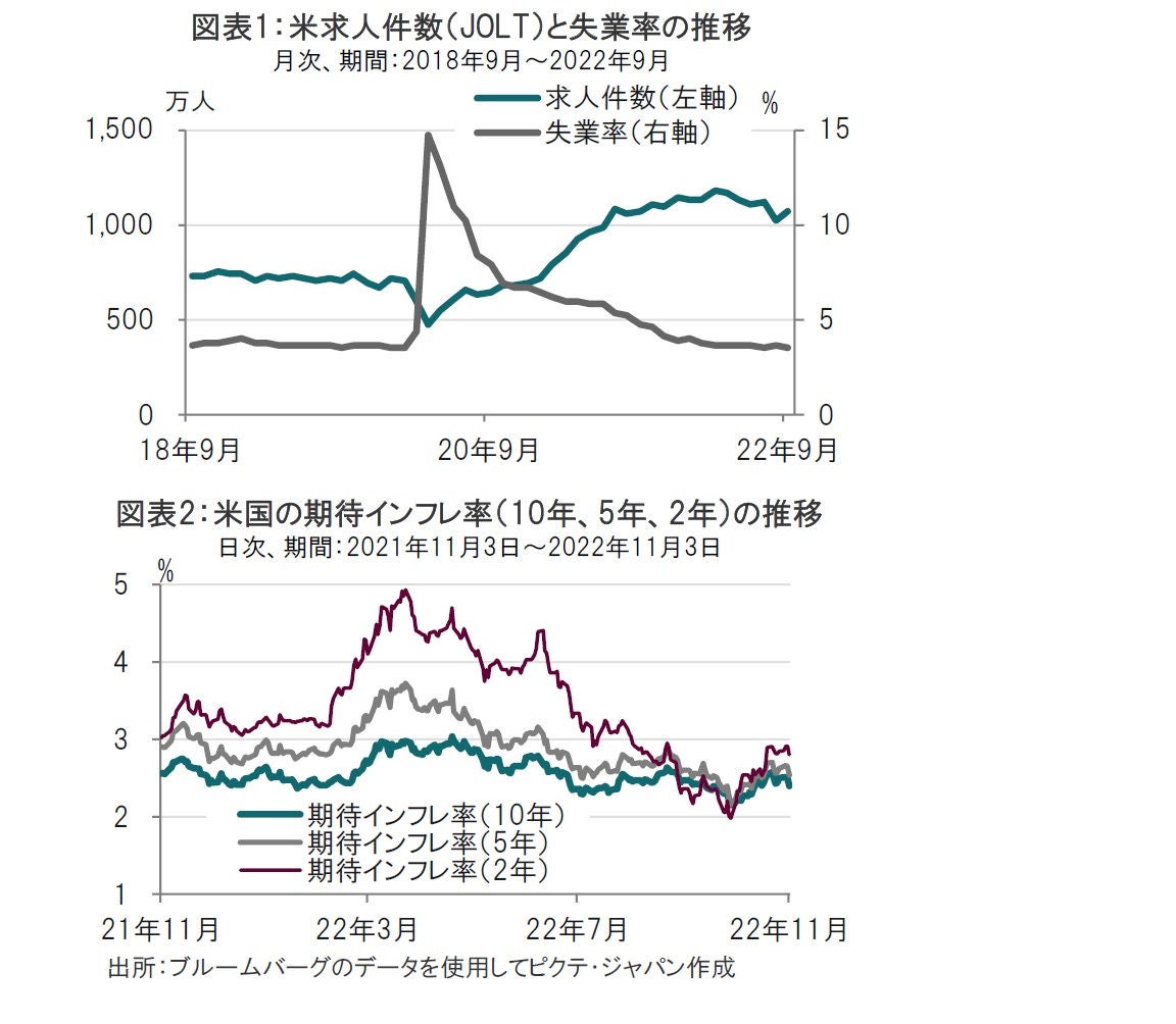 11月のFOMCは声明文で今後の利上げペース減速の可能性を示唆しハト派(金融緩和を選好する傾向)的でした。一方で、依然堅調な労働市場(図表1参照)などを踏まえ、FRBのパウエル議長は記者会見で金融引き締めを緩めないタカ派(金融引き締めを選好する傾向)姿勢を示しました。巧みな組み合わせにより、今後の利上げペース減速の可能性を示唆しながらも、市場の金融緩和に対する過度な期待をけん制したように思われます。市場ベースの期待インフレ率はこれまでのところ落ち着いています(図表2参照)。