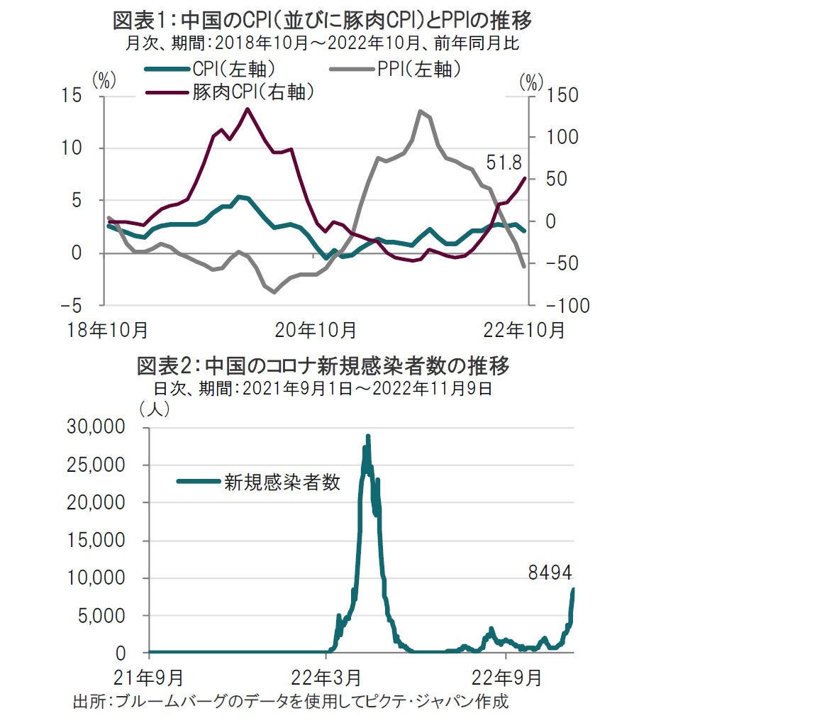 中国国家統計局が2022年11月9日に発表した10月の消費者物価指数(CPI)は前年同月比で2.1%上昇と、市場予想、前月を下回りました(図表1参照)。変動の大きい食品とエネルギーを除いたコアCPIは0.6%上昇と、前月と変わらずでした。