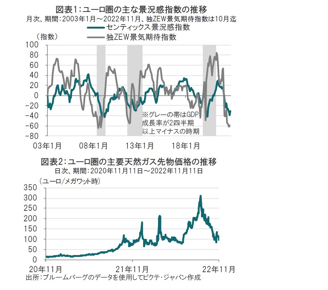 ドイツ(独)の調査会社センティックスが2022年11月7日に発表した11月のユーロ圏のセンティックス景況感指数はマイナス30.9と、市場予想のマイナス35.0、前月のマイナス38.3を上回りました(図表1参照)。