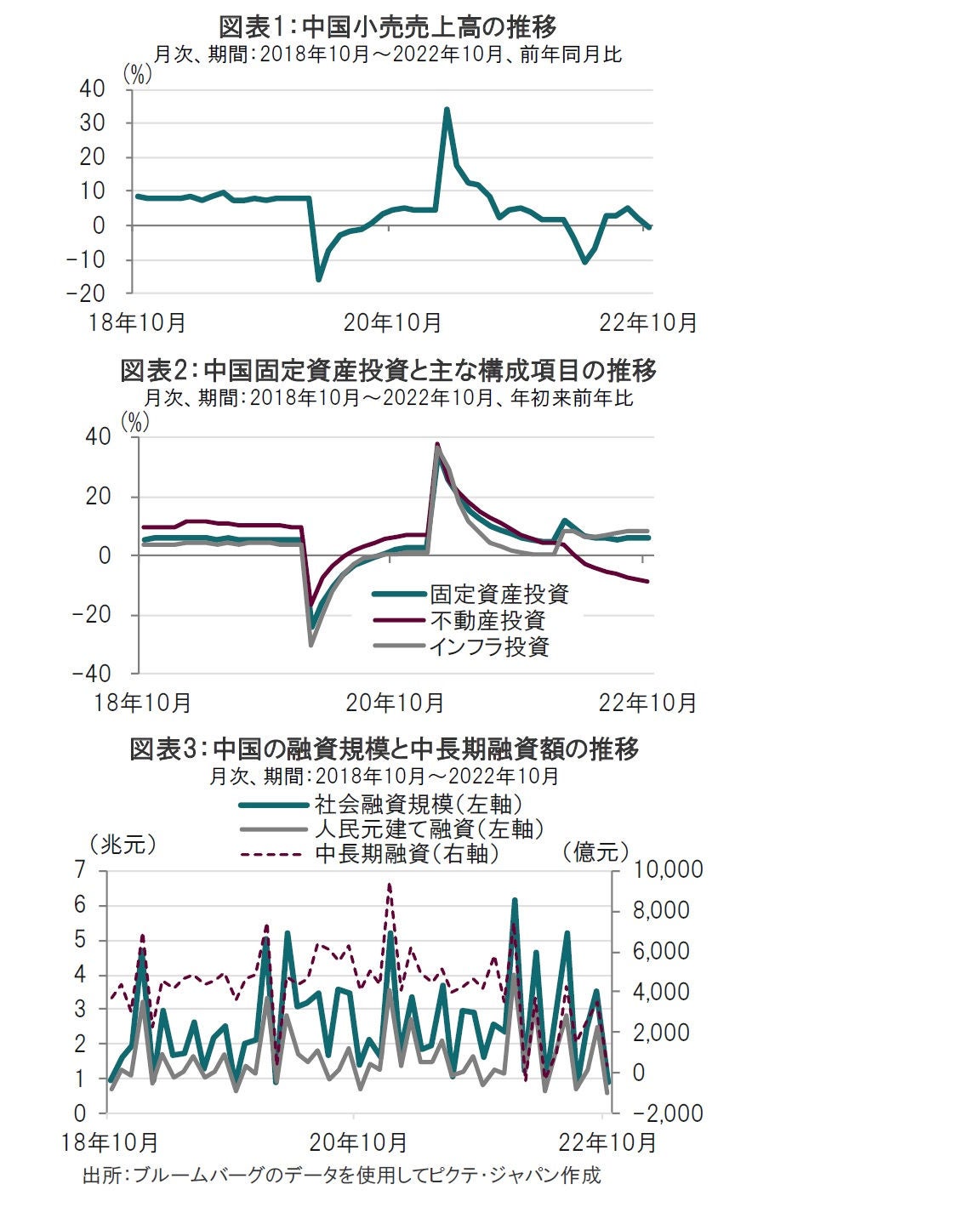 中国国家統計局が2022年11月15日に発表した10月の小売売上高は前年同月比マイナス0.5%減となり、市場予想の0.7%増、9月の2.5%増を下回りました(図表1参照)。