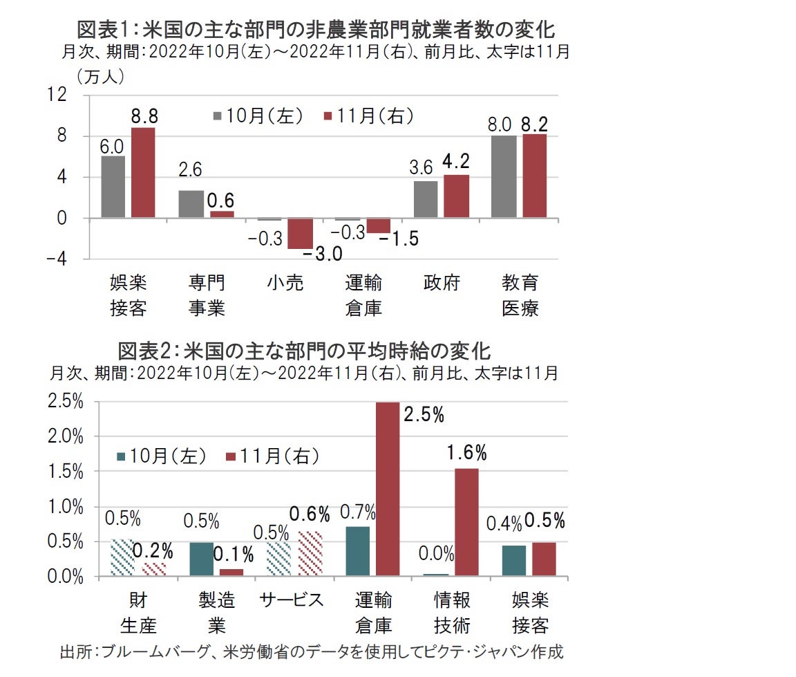 しかし部門別増減をみると、娯楽・接客と、教育・医療、政府部門等が雇用増の大半を占め、部門別の偏りが気がかりです(図表1参照)。また、就業者数は事業所調査に基づきますが、集計方法が異なる家計調査の就業者数は前月比マイナスとなっています。また、給料明細に基づき集計し、サンプル数が大きいADP雇用統計の11月分は前月比12.7万人増と、市場予想を下回る結果でした。集計方法や定義が違うからと言ってしまえばそれまでですが、就業者数全体の動向もデータにより差異があり、今後の展開に注意が必要です。
