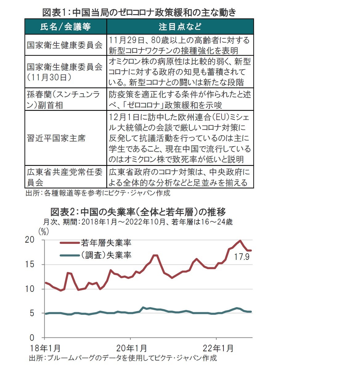 中国の景気減速の一つの要因とみられるゼロコロナ政策に見直しの兆しが見られます。中国当局からゼロコロナ政策緩和を示唆するコメントなどが報道されています(図表1参照)。国家衛生健康委員会からは、足元中国に蔓延しているコロナの病原性は比較的弱いことや、今後の政策の重心が新型コロナウイルスのワクチン接種にシフトする可能性が示唆されています。また、広東省の共産党常任委員会の声明から、ゼロコロナ政策の緩和は地域特性を踏まえ対応にばらつきが見られますが、あくまで中央政府と足並みを揃えた(許可を受けた?)対策であることがうかがえます。