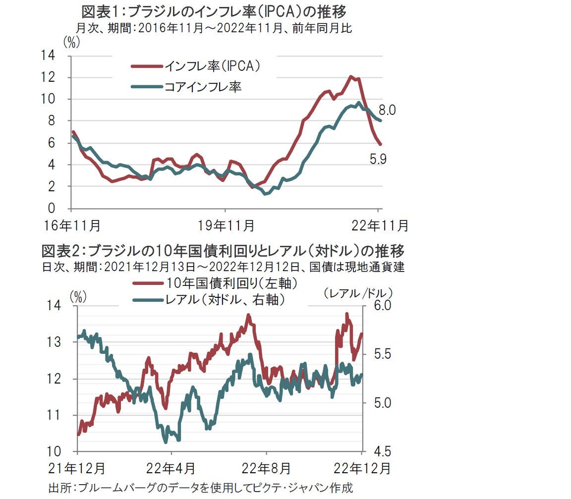 ブラジル地理統計院は2022年12月9日に11月の消費者物価指数(IPCA)を発表しました。前年同月比で5.9%上昇と、市場予想の約6.0%上昇、前月の6.47%上昇を下回りました(図表1参照)。これにより5ヵ月連続で前月の上昇率を下回ったこととなります。原油価格の低下や、燃料・電力にかかる商品流通サービス税(ICMS)の税率引き下げが、インフレ率の低下に寄与したと見られます。