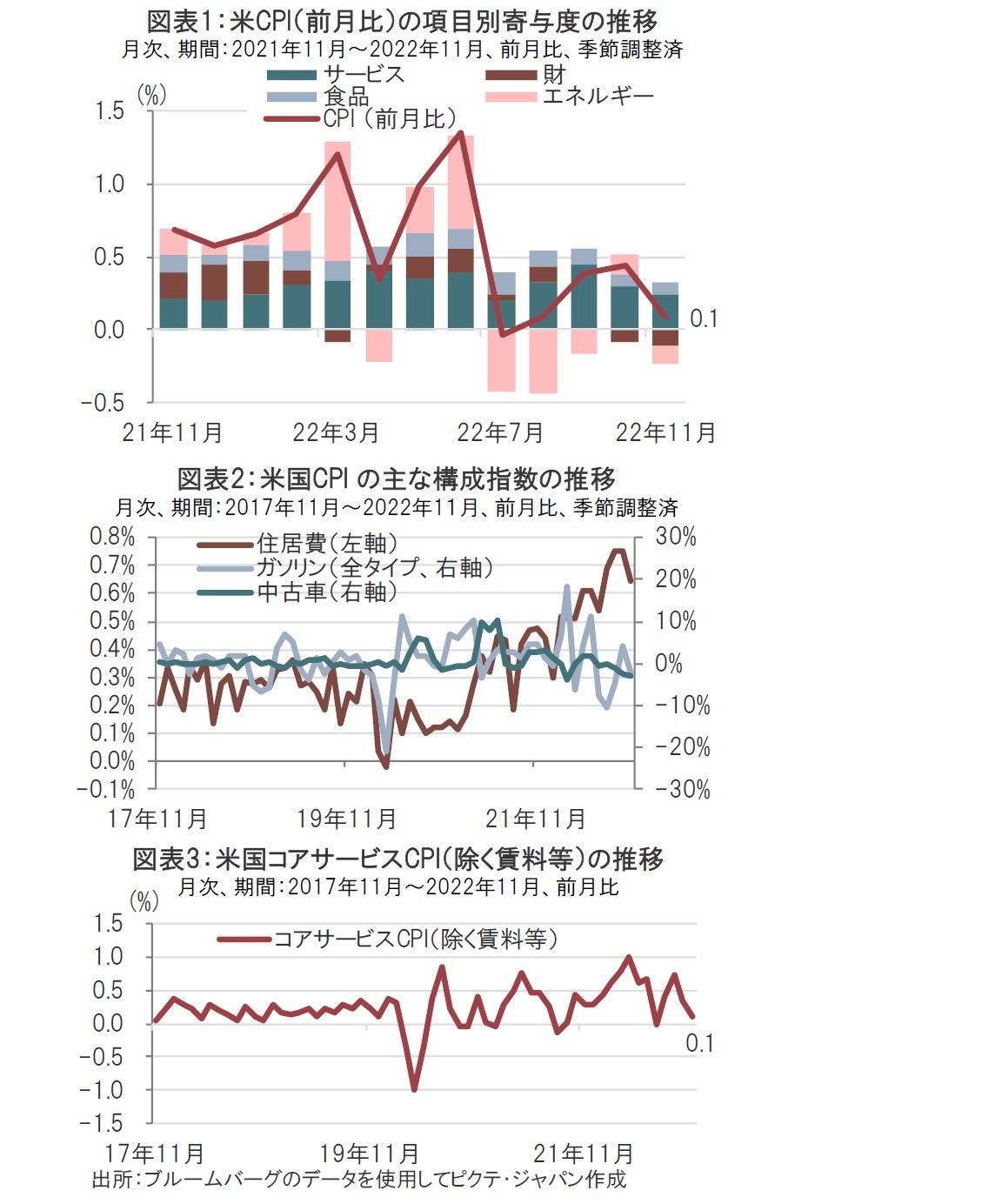 米労働省が2022年12月13日に発表した11月の米消費者物価指数(CPI)は前年同月比7.1%上昇と、市場予想、前月を下回りました。前月比では0.1%上昇と(図表1参照)、市場予想の0.3%上昇、前月の0.4%上昇を下回りました。