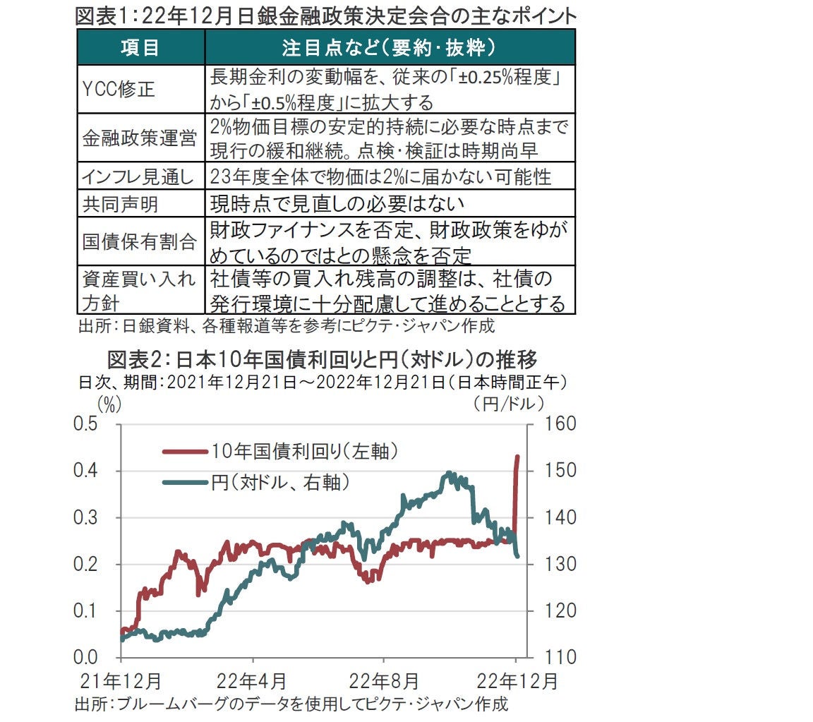 日銀は2022年12月19~20日に開催した金融政策決定会合で、市場予想に反し大規模緩和を修正する方針を決定しました。長期金利(新発10年国債利回り)の誘導水準は「ゼロ%程度」に据え置きつつ、変動許容幅を±0.25%から0.50%に拡大し(図表1参照)、長短金利操作(イールドカーブ・コントロール、YCC)政策を修正しました。