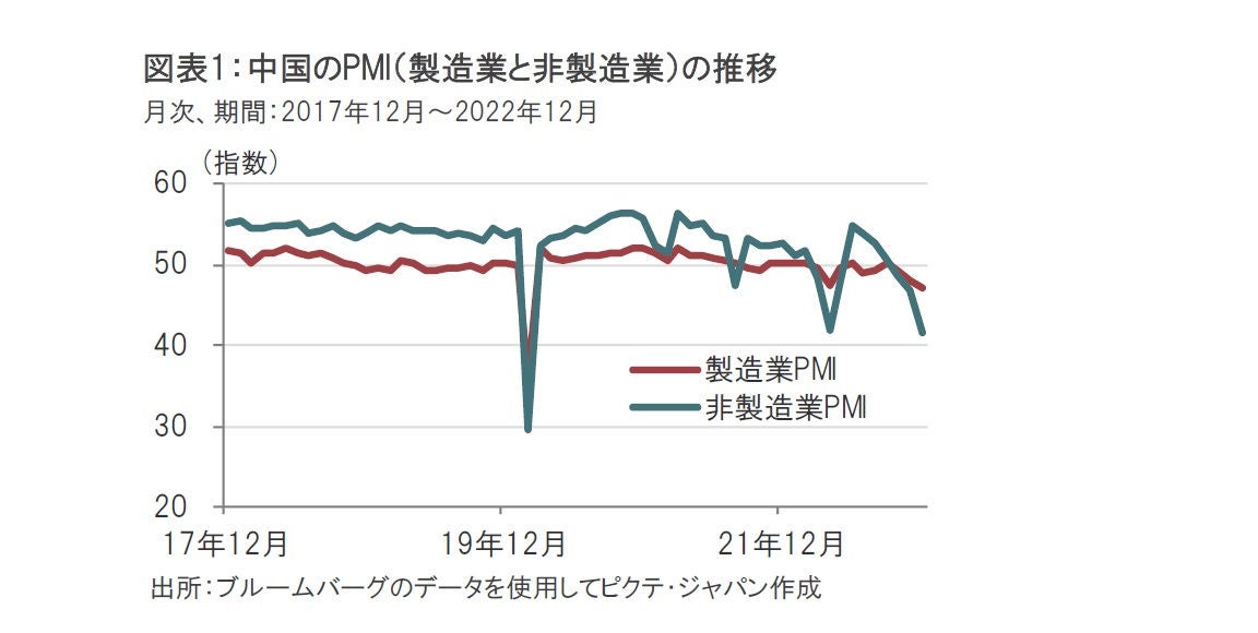 中国国家統計局が2022年12月31日に発表した22年12月の製造業購買担当者景気指数(PMI)は47.0と、市場予想の47.8、前月の48.0を下回りました(図表1参照)。