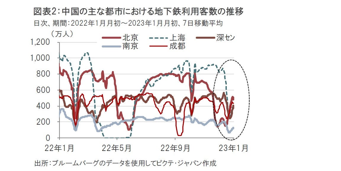 この辺りの事情をリアルタイムデータで確認します。中国の主な都市の地下鉄利用客数は12月前半に大幅に減少しました(図表2参照)。もっとも、ゼロコロナ政策の緩和は特に12月前半に段階的に進められてきており、地下鉄利用客数の減少がゼロコロナによるものか、感染急増を懸念してのものかを区別するのは困難ですが、政策変更の混乱がPMIを押し下げた可能性は高いと見ています。