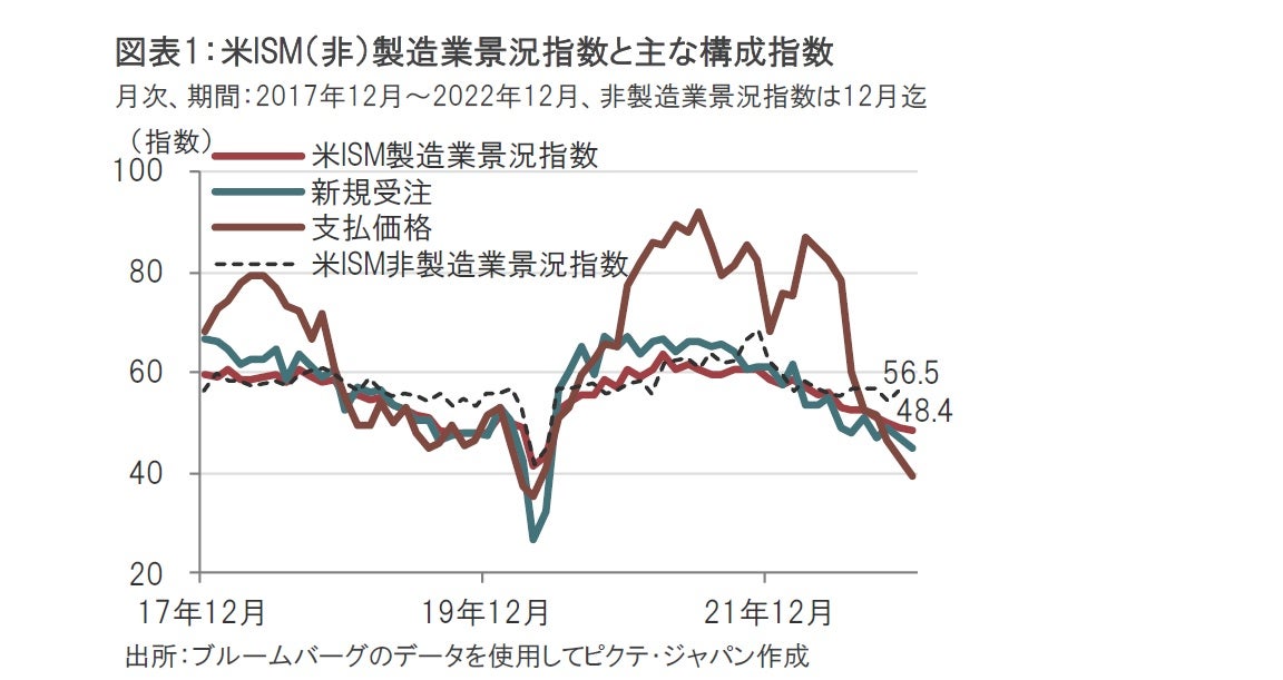 ただし、足元の米経済指標の一部には前のめりの市場の見方を支持するものも見られます。例えば昨年12月の米ISM製造業景況指数は48.4と前月の49.0を下回り、2か月連続で景気縮小の目安である50を下回りました(図表1参照)。先行きを示唆する傾向がある新規受注指数も軟調です。さらに、これまでインフレ上昇圧力を示唆してきた支払価格指数は12月が39.4と急低下しています。少なくとも、財価格についてはインフレのピークアウトが見込まれます。