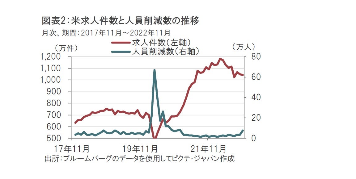 サービス産業の価格動向は概ね賃金で、FRBも市場関係者も賃金に関連する様々な労働市場のデータに注目しています。4日には22年11月の求人件数が発表され約1046万件と市場予想を上回りました(図表2参照)。求人件数はピークを下回るも依然高水準です。労働市場の底堅さがうかがえます。