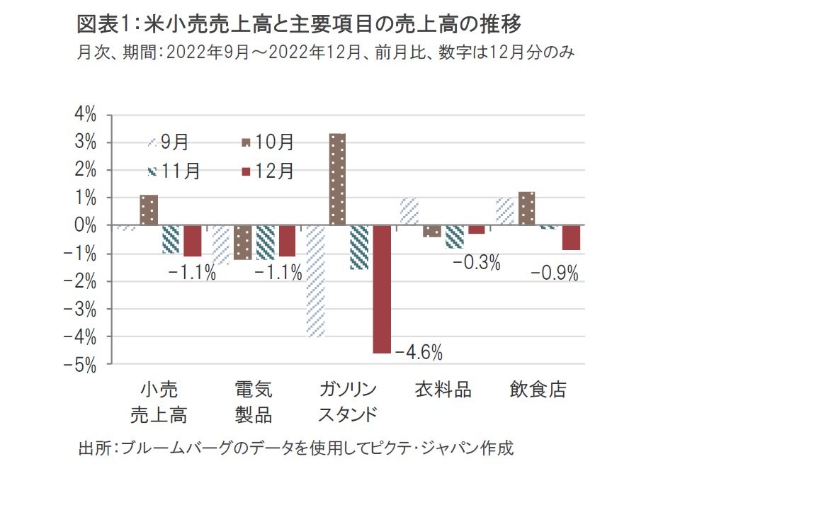 米商務省が2023年1月18日に発表した22年12月の米小売売上高は前月比マイナス1.1%減と、市場予想のマイナス0.9%減や、前月のマイナス1.0%減を下回りました(図表1参照)。