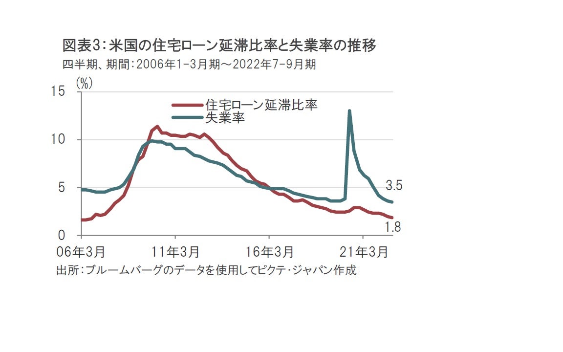 この懸念はあくまで、将来の話です。足元は異様なまでに安定しています。家計の代表的な債務である住宅ローンの延滞比率を見ると極めて低水準だからです(図表3参照)。過去の失業率と住宅ローンの延滞率の動きを見ると、同程度で推移する傾向が見られます。一方、足元の住宅ローン延滞率は失業率を大幅に下回っています。また、コロナ禍で失業率が急上昇したものの、延滞率への影響は限定的でした。失業率の上昇が短期に収束したことも含め、米当局の大胆な金融・財政政策の効果が大きかったためと見られます。