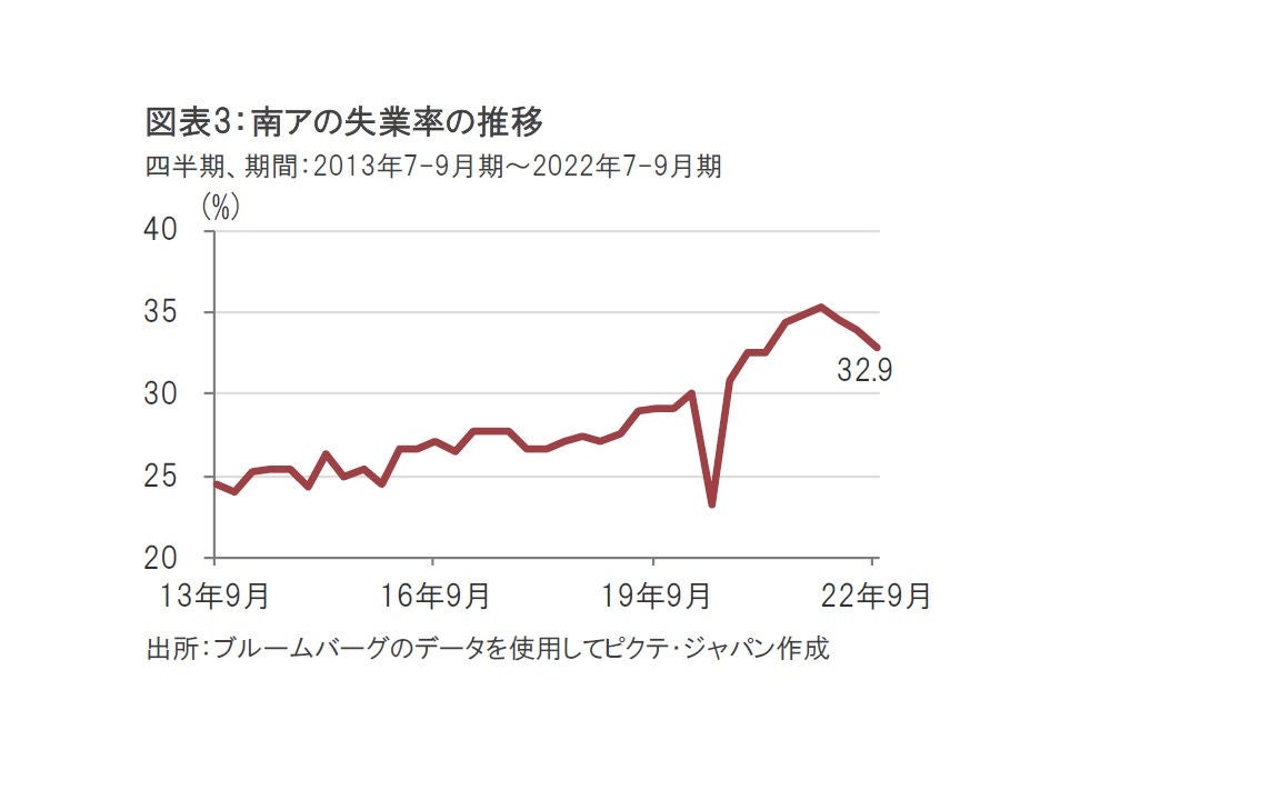南アの構造問題である失業率の高さも続いており、ピークアウト感がみられます(図表3参照)。しかし、水準はコロナ禍前を上回るうえ、今後の景気悪化で再上昇する懸念もあります。金融政策も景気動向を無視することが難しくなりつつあるようです。