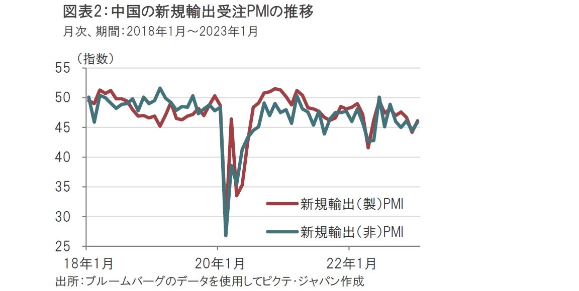では、死角はないのか?1月のPMIで回復が鈍いセクターもあり、その1つが輸出です。例えば、製造業の新規輸出受注PMIは46.1と、昨年12月の44.2は小幅上回るも、11月の46.7は下回るなど緩やかな回復にとどまっています(図表2参照)。非製造業の新規輸出受注PMIは45.9と節目の50を下回っています。世界的な景気減速が懸念される中、外需の拡大余地は限られそうです。