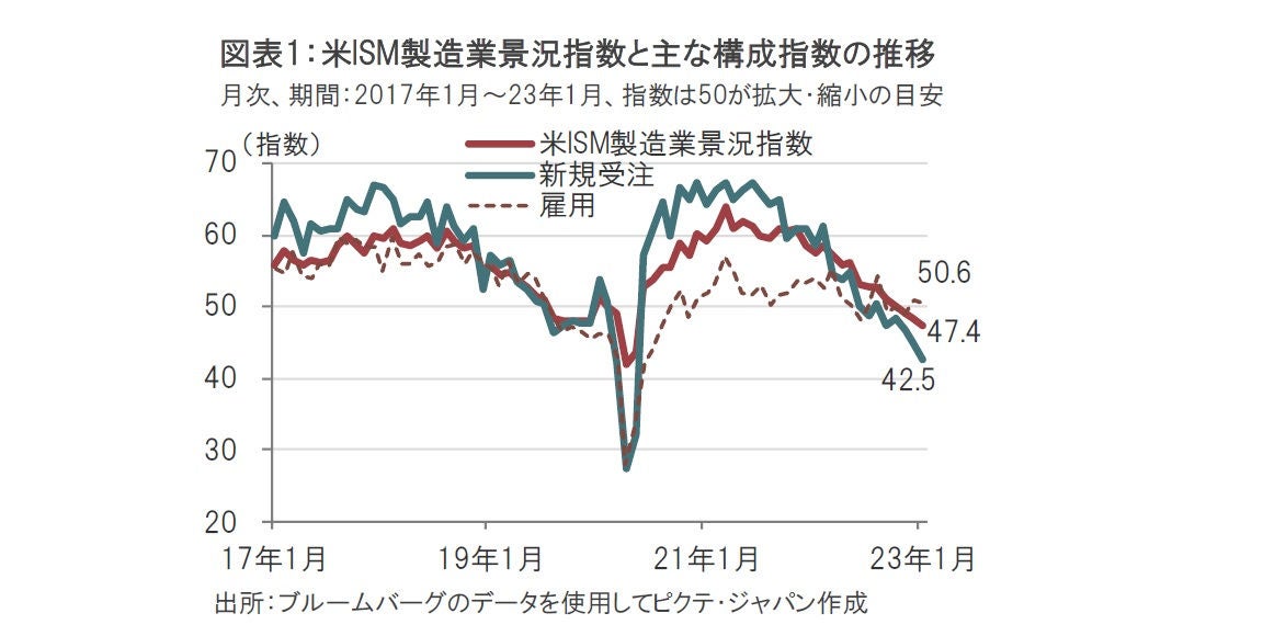 なお、FOMCの結果が公表された1日には、米国で23年1月の米ISM製造業景況指数(図表1参照)や、米民間雇用サービス会社ADPが発表した米国の民間雇用者数、並びに12月の雇用動態調査(JOLTS)による非農業部門の求人件数などが発表されました。内容を見ると、強弱まちまちの結果となりました。